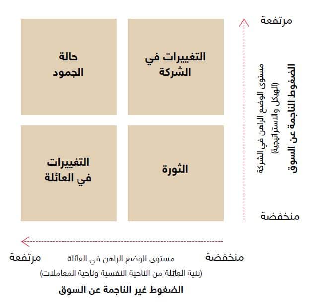 يمكن أن تؤثر الضغوط الناجمة عن السوق والضغوط غير الناجمة عن السوق على عملية اتخاذ القرارات لدى وريث قيادة الشركة. لكنّ أنواع التغييرات ووتيرتها ستحددها مستويات الوضع الراهن في كل من العائلة والشركة. بيد أن القادة الذين يخلفون في قيادة الشركة يعتقدون أن هذه الضغوط ومستوى وضعها الراهن يحددان التغييرات التي تطرأ. ويمثل مستوى الوضع الراهن حدود معرفة الجيل الجديد من أفراد العائلة بشأن الضغوط الناجمة عن السوق والضغوط غير الناجمة عن السوق، ومدى إحداثه (أو عدم إحداثه) تغييرات في جانب العائلة للحفاظ على تناغم العلاقة بين العائلة والشركة، أو تغييرات في جانب الشركة للحفاظ على القدرات التنافسية للشركة.