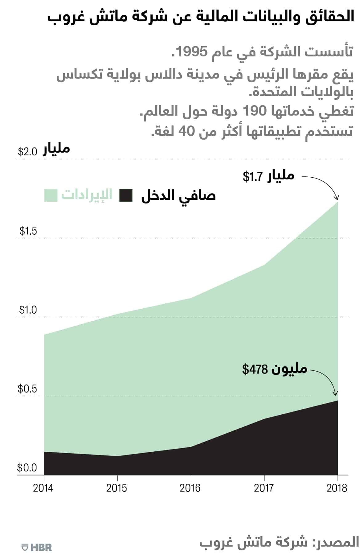 يتفشى في العالم وباء الوحدة ويلزمنا التصدي له. وتتميز شركة ماتش غروب بقدر واسع من النطاق والخبرة، ونحاول استخدام هذه المزايا لنكون أكثر ذكاءً وأسرع من منافسينا. ويلزمنا مواصلة الابتكار، لأن ما نقوم به هو عمل ذو جدوى. إذ يتفشى في العالم وباء الوحدة. وقد بدأ الأشخاص في فهم العواقب الصحية المترتبة على هذه الوحدة، ويلزمنا التصدي لها. وحتى في مجتمع قائم على التقنية، يتوق الأشخاص إلى العلاقات الحميمة، سواء أكان ذلك يعني الزواج أو مجرد الجلوس معاً لتناول القهوة. ونحن نساعد الأشخاص على إقامة تلك العلاقات. وقد أثبت البحث عن سبل أكثر فاعلية للقيام بذلك جدواه العظيمة في هذا الشأن.
