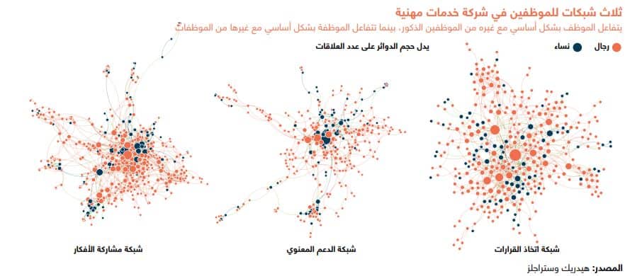 لتقييم مدى شمولية ثقافة مؤسسة ما يلزم عدم حصر الاهتمام بعدد الموظفين من الفئات التي تكون مهمشة في العادة. بل يتطلب ذلك قياس مدى تفاعل العاملين من المجموعات المختلفة فعلياً. عمل الباحثون مع إحدى شركات الخدمات المهنية الضخمة لتقديم تحليل شبكي لتحديد لمن يلجأ كل موظف لطلب المساعدة في اتخاذ القرارات أو الحصول على النصائح، وأي العلاقات كانت متبادلة. يفوق عدد الرجال عدد النساء في الشركة بنسبة 1:5، غير أن الدراسة تبين فوق ذلك أن احتمال مشاركة المرأة في صنع القرار والابتكار أقل مما تتيحه هذه النسبة أيضاً. ويرى الباحثون أن شبكة العلاقات الصحية تفترض أن يكون للموظفة علاقات مماثلة للعلاقات التي يحظى بها الموظف، كما يقل فيها عدد الموظفات المهمشات.