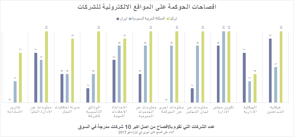 أما بالنسبة للشركات الإيرانية، فتلتزم غالبيتها بمتطلبات الإفصاح المحلية من خلال الإعلان عن معلومات متعلقة بالجمعيات العمومية وغيرها من نشاطات الحوكمة. وتُظهر هذه الشركات ممارسات أفضل من السوقين النظيرين فيما يخص نشر معلومات الملكية والهياكل التنظيمية. لكن، يُلاحظ الافتقار الكامل إلى الإفصاح عن باقي جوانب الحوكمة على مواقع الشركات. فلا تُفصح الشركات الإيرانية أية معلومات عن تركيبة مجلس الإدارة، كما لا تلزمها القوانين المحلية بالإفصاح، عن أية تفاصيل تتعلق بهياكل الحوكمة وممارساتها.