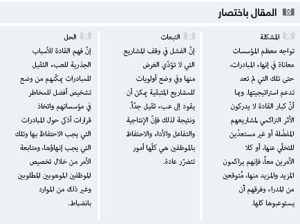 وضع فقرة خاصة بآلية إنهاء كل مبادرة تحدّد فيها تاريخاً نهائياً للتمويل والعدد المخصّص من الموظفين، بحيث لا تستهلك المشاريع الموارد عاماً تلو الآخر ما لم يكن تأثيرها على أعمال الشركة كبيراً.