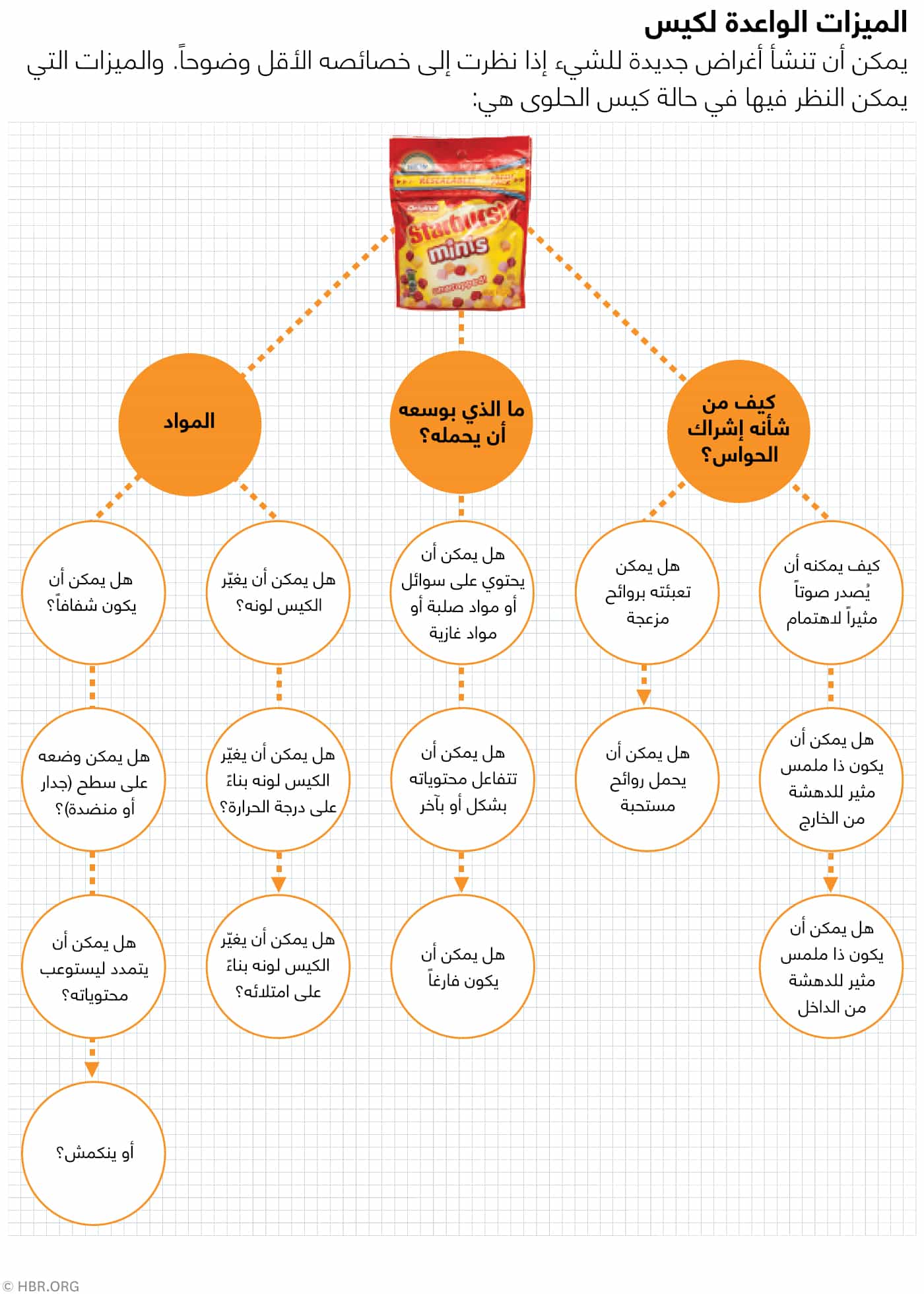ولكن كيف يمكنك أن تفعل ذلك؟ مثلما استخدم الطيارون قوائم المراجعة منذ وقت طويل للتأكد من عدم تخطيهم لأي خطوات ضرورية عند التحضير لرحلة طيران، طوّرنا قائمة مراجعة لأنواع ميزات المنتج التي غالباً ما يتجاهلها الأشخاص. وسواء أكان منتجك شيئاً مادياً أو عملية غير ملموسة، نوصيك بتطوير قائمة للمراجعة بالميزات التي كانت مهمة لمشاريع الابتكار السابقة والحالية الخاصة بك وإضافة ميزات إلى القائمة مع كل مشروع جديد. ويمكن للفِرق العاملة في مشاريع الابتكار الاسترشاد بالقائمة لحفزهم على النظر في الميزات التي ربما يغفلونها، وبالتالي توفير الوقت والجهد والإحباط. وقد أتاحتْ لنا دراسة كيس الحلوى مع وضع قائمتنا للمراجعة في الاعتبار الكشف بسهولة عن العديد من الميزات التي يمكن أن تؤدي إلى تصميمات جديدة واستخدامات جديدة. أولاً، كل كيس يباع يحتوي على شيء بداخله. وهذه الميزة واضحة للغاية يتم التغاضي عن عدم وجودها عادة. لمَ لا تبيع الأكياس الفارغة بحيث يمكن للعملاء أن يقرروا الأغراض التي يستخدمونها فيها؛ مثل المجوهرات والفكة واللوازم الأساسية ومستحضرات التجميل وما إلى ذلك؟ ولك أن تتخيل الأكياس الفارغة إلى جانب أكياس الساندويتش وأكياس المجمدات وأكياس التخزين في السوبر ماركت. ثانياً، معظم الأكياس المباعة هي بحجم يدك. ويضفي النظر بطريقة منهجية في إجراء تغييرات على حجم الأكياس أفكاراً جديدة للمحتويات المحتملة لهذه الأكياس. يمكنك، على سبيل المثال، بيع غالون من الدهان في كيس قابل لإعادة الإغلاق. ثالثاً، الأكياس الحالية لديها حيّز داخلي واحد. ولكن ماذا يمكن أن تفعل بكيس له أكثر من حيّز؟ يمكنك، على سبيل المثال، بيع الأكياس المكونة من جزأين للأشياء التي ترغب في مزجها معاً لاحقاً، مثل وضع الحبوب في الجزء العلوي من الكيس ووضع الحليب في الجزء السفلي، ووضع السَلطة في الجزء السفلي والصلصة في الجزء العلوي، وما إلى ذلك. رابعاً، النظر إلى الكيس باعتباره وعاءً للروائح (أو باعتباره وسيلة احترازية منها). يمكنك بيع كيس كبير باعتباره صندوق للقمامة يُغلق ليحتفظ بالرائحة. وهذه مجرد أمثلة قليلة من التصميمات الجديدة التي تنبثق من التفكير في قائمة مراجعة للميزات التي لا تحظى بالملاحظة.