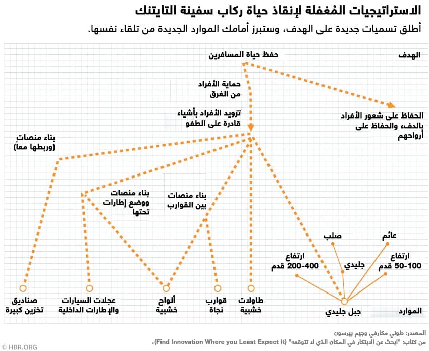 وبعد ذلك، نجد سبلاً مختلفة للتعبير عن الهدف لإظهار حلول مختلفة. على سبيل المثال، ستتمثل الأهداف المختلفة قليلاً في "تدفئة الأشخاص وإبقاؤهم أحياء" و"إبقاء الأشخاص خارج الماء". ودعونا ننظر عن كثب إلى أحد الخيارات وهو إبقاء الأشخاص خارج الماء. إحدى الطرق لفعل ذلك هي وضعهم على أشياء عائمة - ليس قوارب النجاة فحسب - التي يمكن أن تستحث النظر بصورة أوفى في الموارد المتاحة. وربما تتذكر أن العوامات الخشبية، على سبيل المثال، تشير إلى أن الطاولات الخشبية يمكن أن تكون مفيدة. ويمكن أن تكون الألواح، أو ربما الأبواب، من السفينة قد وُضعت بين قوارب النجاة لحمل المزيد من الأشخاص خارج الماء.