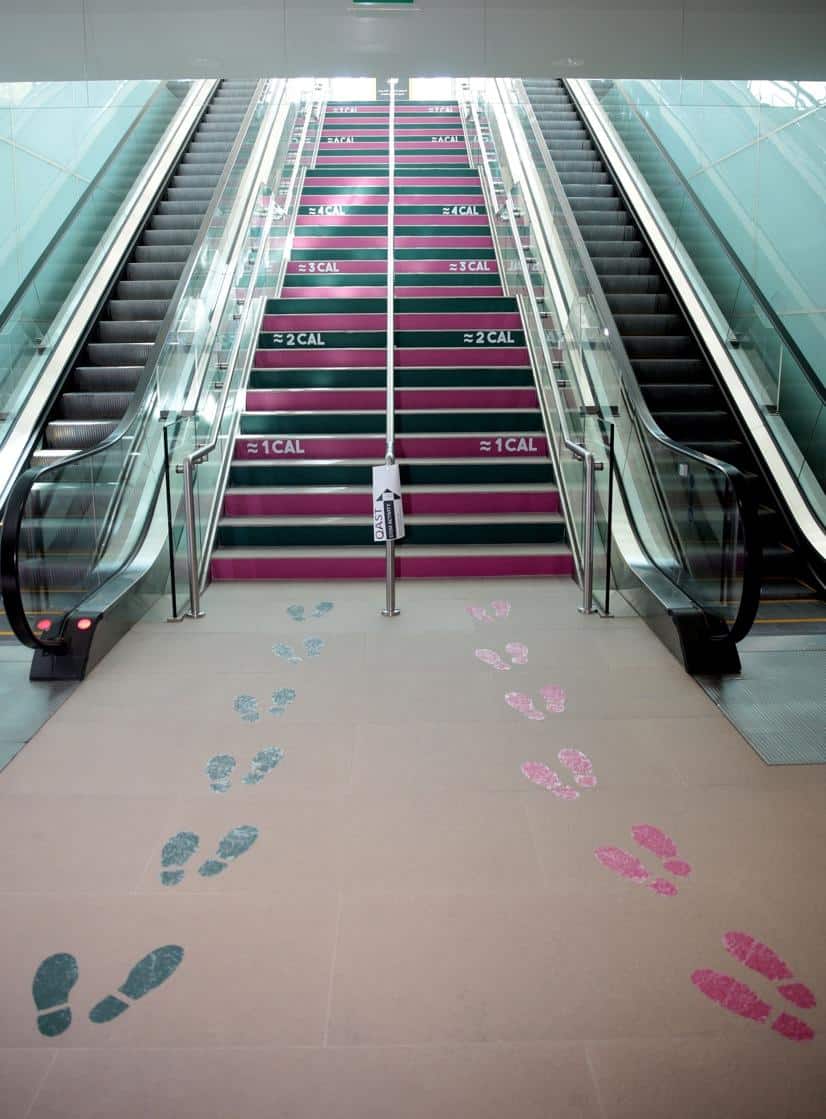 وأخيراً، سألت المجموعة الثالثة الناس ما إن كانوا متأكدين من رغبتهم في استخدام السلالم المتحركة أو المصاعد ووضعوا آثار أقدام على الأرض متجهة إلى السلالم العادية وكتابة حساب السعرات الحرارية التي يحرقها الجسم على الدرج. وأدى هذا التدخل إلى زيادة استخدام السلالم العادية بنسبة 107%.