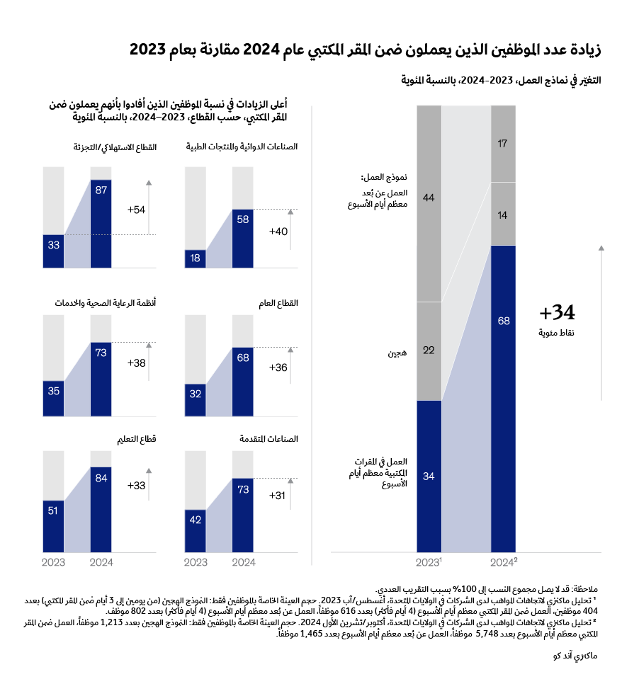 تضاعفت نسبة العاملين ضمن المقر المكتبي معظم أيام الأسبوع (4 أيام على الأقل أسبوعياً) بين العينتين لتصل إلى 68%، مقارنة بنسبة 34% سابقاً. في المقابل، انخفضت نسبة العاملين عن بُعد معظم أيام الأسبوع (4 أيام على الأقل أسبوعياً) إلى 17%، بعد أن كانت 44%، أي بتراجع تجاوز النصف. كما تراجعت نسبة العاملين ضمن النموذج الهجين (الذين يعملون في المقرات المكتبية من يومين إلى 3 أيام أسبوعياً) إلى 14%، بعد أن كانت 22% (انظر الشكل التوضيحي 1).