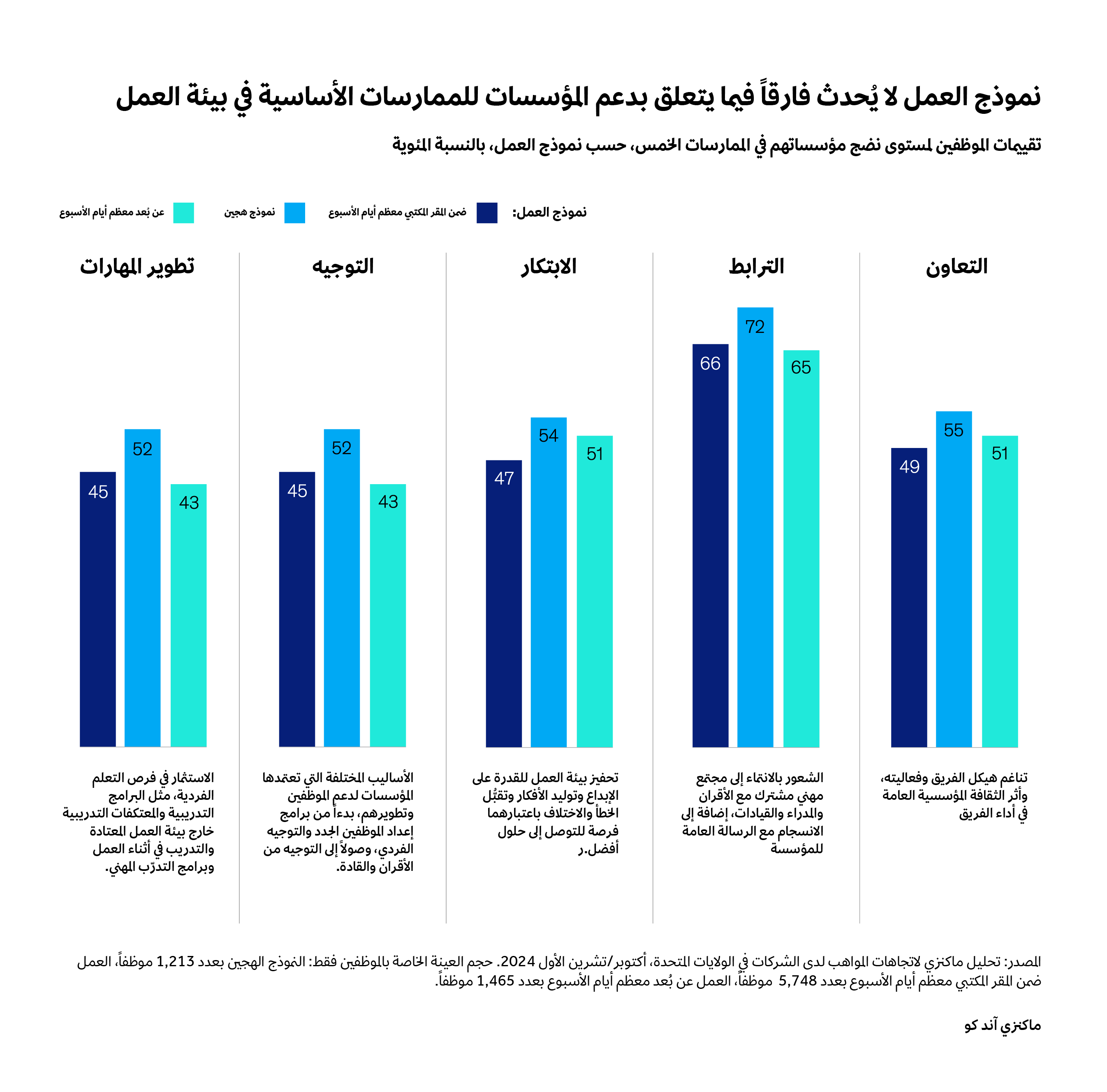 في الواقع، أفاد المشاركون على اختلاف نماذج عملهم أن مؤسساتهم تُقصِّر في دعم 5 ممارسات أساسية تُسهم في تحسين الأداء وتعزيز الصحة المؤسسية، وهي: التعاون والترابط والابتكار والتوجيه وتطوير المهارات. وغالباً ما يستند القادة إلى هذه الممارسات باعتبارها أبرز أسباب مطالبة الموظفين بالعودة إلى المقرات المكتبية.