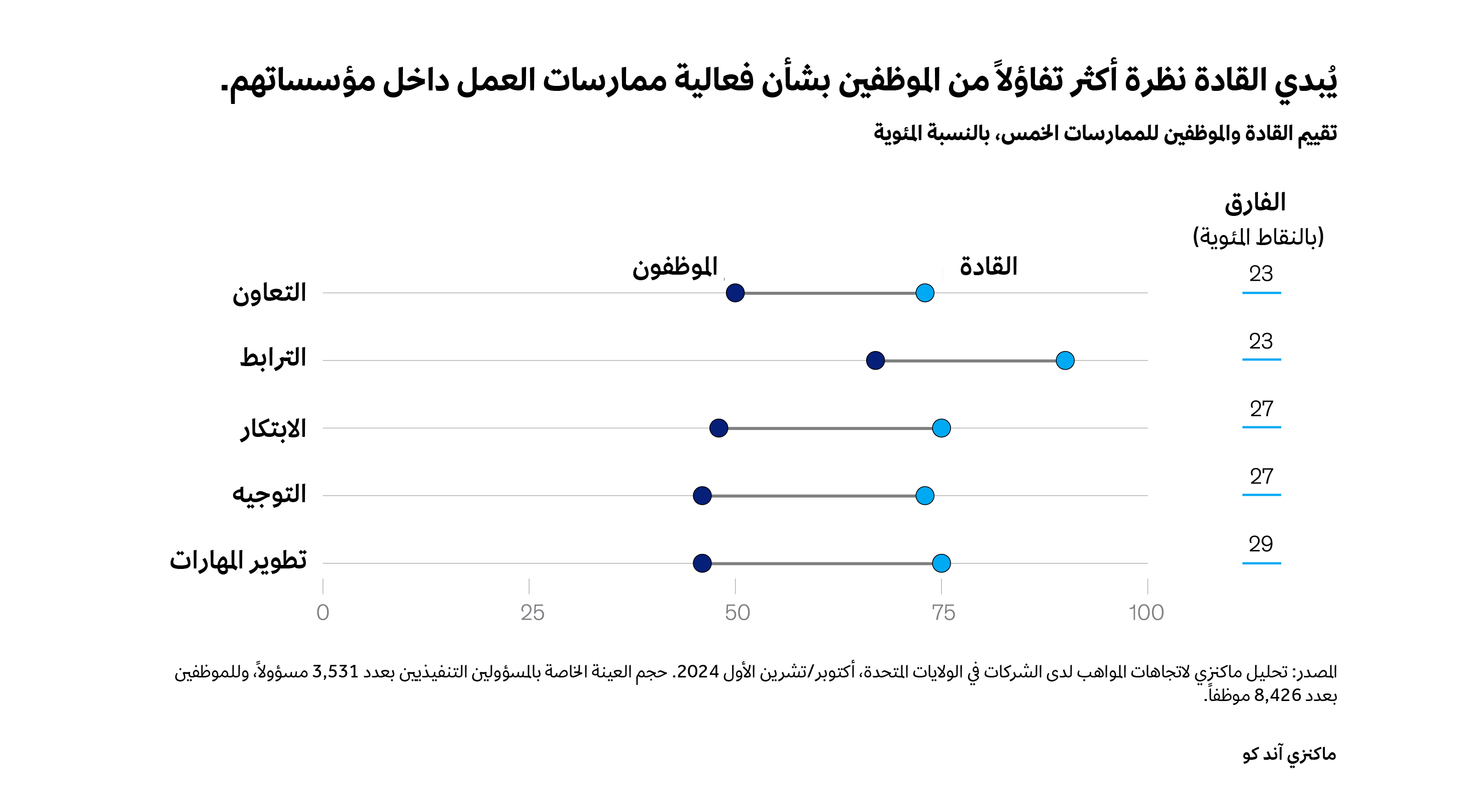 ومن العوامل التي تُعقّد الوصول إلى حل فعال اختلاف التصورات بين القادة والموظفين بشأن مدى نضج الممارسات الخمس وفعاليتها في كل نموذج عمل؛ إذ يميل القادة إلى إعطاء تقييمات أعلى بكثير مقارنة بآراء الموظفين في كل نموذج (انظر الشكل التوضيحي 3).