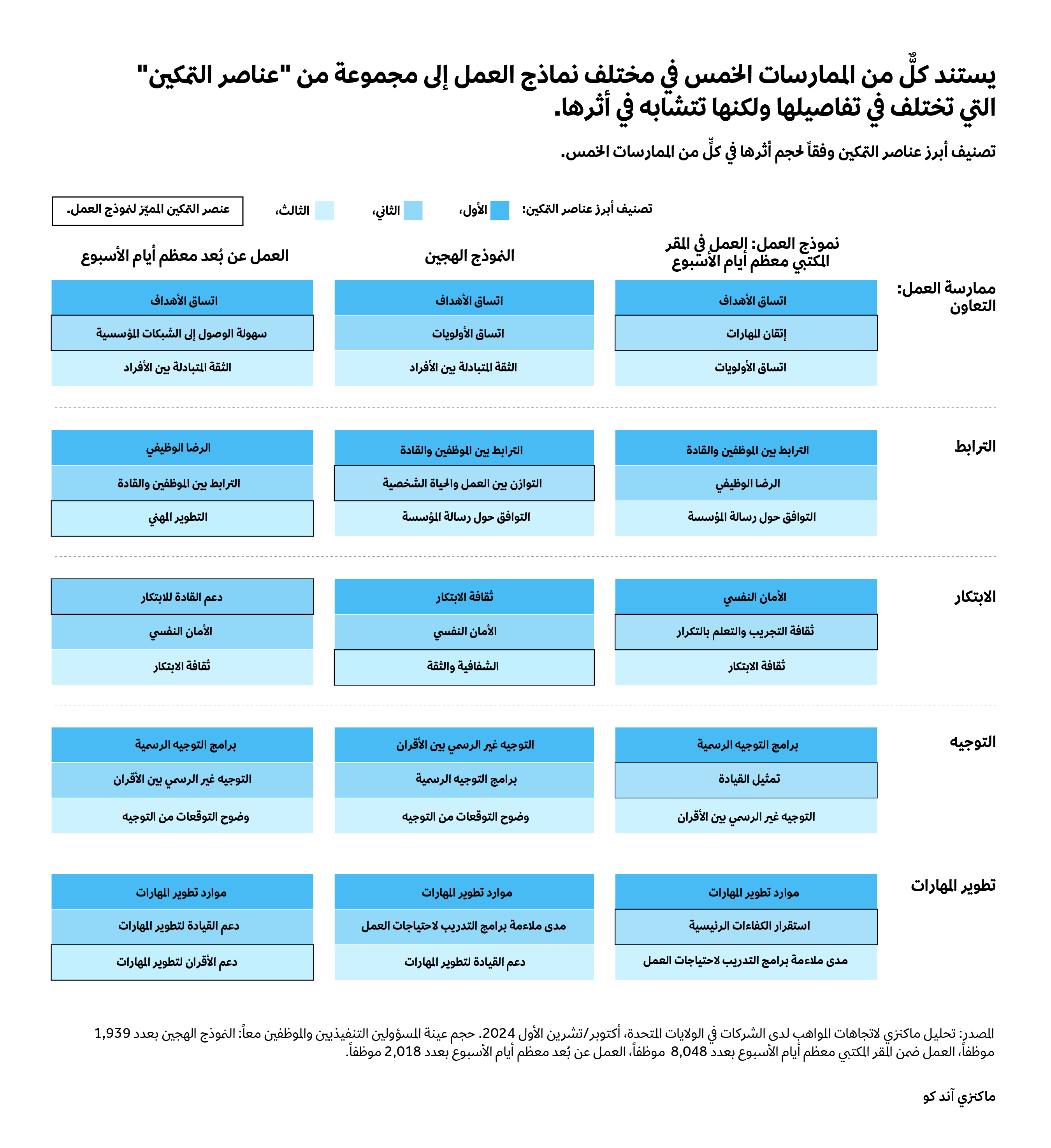 تعكس عناصر التمكين هذه طبيعة العلاقات والسلوكيات السائدة في كل نموذج عمل، ومنها أوجه التشابه والاختلاف في تجارب الموظفين. وتشترك الممارسات الخمس جميعها عموماً في عنصرين على الأقل من عناصر التمكين عبر مختلف نماذج العمل، ما يشير إلى تشابه متطلبات النجاح المؤسسي إلى حدٍّ كبير، مع بعض الاختلافات التي يفرضها نموذج العمل المعتمد.