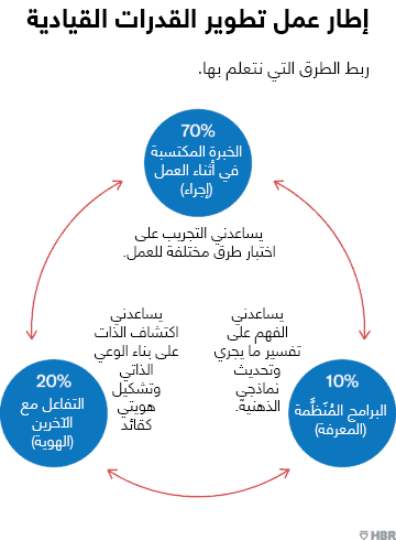 تتمثّل الخطوة الأولى في فهم كيفية تطوّر القادة أنفسهم بطريقة تجعلهم يتجاوزون النظرية الشهيرة التي تقول إن 70% من التعلم يحدث من خلال الممارسة (الخبرة المكتسبة في العمل)، و20% من خلال التقييم وزيادة الوعي الذاتي (المكتسب من خلال التفاعلات مع الآخرين)، و10% من خلال التدريب الرسمي. وقد توصّل بحثنا الكمي والنوعي الذي أُجري على مدى السنوات الثلاث الماضية إلى إطار بديل نعتقد أنه أكثر فعالية التعليمية، ويشدّد هذا الإطار على 3 إجراءات محدّدة:
