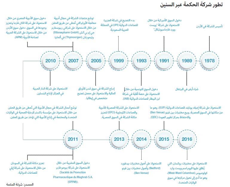 كانت خطتي تنطوي على زيادة التركيز على قطاع أدوية المستشفيات الطبية (أدوية السرطان والمحاقن) والنهوض بها، فقد كان هذا القطاع يبدو واعداً عالمياً، بينما لا يزال يراوح مكانه خارج سلم الأولويات في شركتنا داخل منطقتنا في العالم العربي. وفي عام 2015 شهدت وعملت مع فريق عمل عملية الاستحواذ على شركة إيميك يونايتد للصناعات الدوائية (EUP) في مصر، وهو ما عزز مكانة الشركة في السوق المصرية حيث وضعنا خطة عمل استراتيجية لإدارة الأعمال وقمنا بتأسيس قسم حكمة المتخصص.