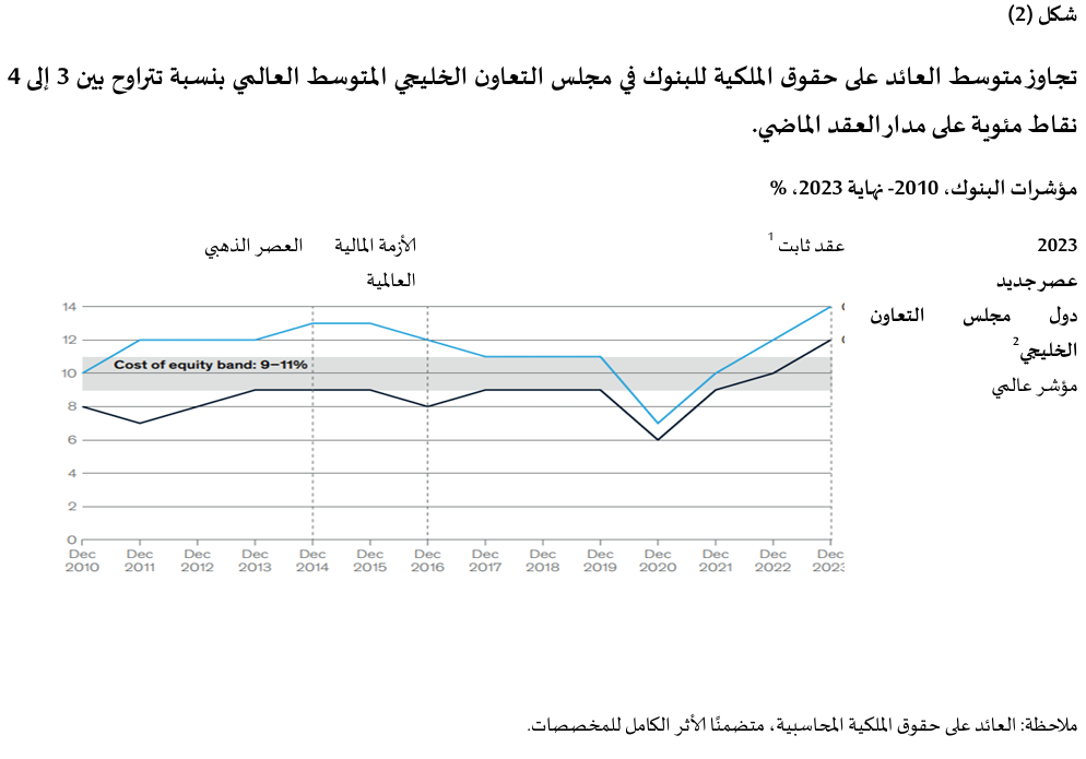 (1) بالنسبة لعامي 2020 و2021، أُجريت تعديل العائد على حقوق الملكية لتأخذ في الاعتبار دورات المخصصات خلال جائحة كوفيد-19. (2) بنوك مجلس التعاون الخليجي. المصدر: إس أند بي جلوبال؛ ماكنزي بانوراما