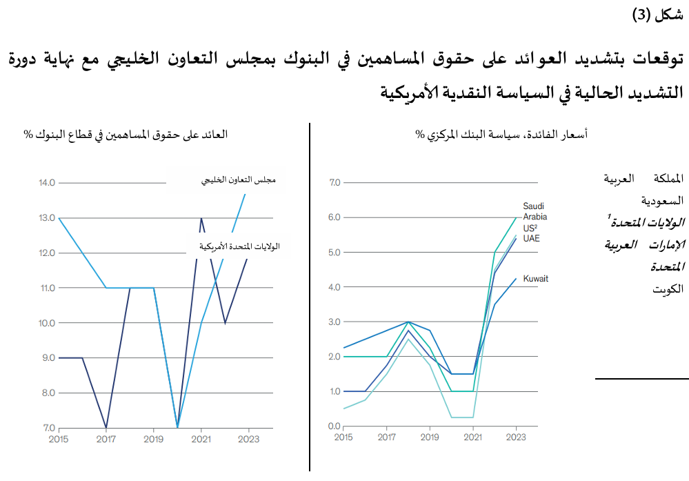 ترتبط أسعار صرف عملات دول مجلس التعاون الخليجي بالدولار الأمريكي، ما يجعل أسعار الفائدة في المنطقة تتبع تغيرات أسعار الفائدة الأمريكية عن كثب. وأدت إجراءات الاحتياطي الفيدرالي في عام 2023 إلى زيادة تكاليف التمويل في دول مجلس التعاون الخليجي، ما أسفر عن زيادة أرباح البنوك المحلية والعالمية. وعلى الرغم من ذلك، بقيت معدلات التضخم منخفضة عند نحو 2.6 في المئة في عام 2023، ومن المتوقع أن تنخفض إلى 2.3% في عام 2024.