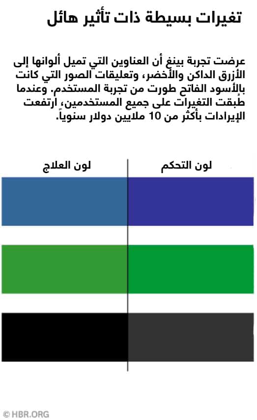 لقد علمنا أن أفضل علماء البيانات يكونون متشككين، ويتبعون قانون تويمان، الذي يقول: أي رقم يبدو مثيراً للاهتمام أو مختلفاً يكون في الغالب خاطئاً. ينبغي أن تُكرَّر النتائج المفاجئة، لكي يتم التأكد من أنها صالحة ولتبديد شكوك الناس. في عام 2013، أجرت بينغ مجموعة من التجارب مع ألوان نصوص عديدة ظهرت على صفحة نتائج البحث الخاصة بها، بما في ذلك العناوين والروابط والتعليقات أسفل الصور. على الرغم من أن تغييرات الألوان كانت طفيفة (انظر الشكل)، كانت النتائج إيجابية بطريقة عير متوقعة: إذ أظهرت أن المستخدمين الذين رأوا ألوان العناوين التي تميل إلى الأزرق الداكن والأخضر، والذين رأوا الأسود الفاتح في تعليقات الصور، كانوا ناجحين في عمليات بحثهم في نسبة أكبر من الوقت، وأن هؤلاء الذين عثروا على ما يريدون توصلوا إلى مبتغاهم في وقت لا يذكر.