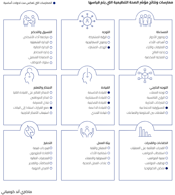 يقيّم مؤشر الصحة التنظيمية من ماكنزي الشركات من خلال 9 مجالات أساسية للفعالية الإدارية. تشمل هذه المجالات: أولاً، الاتجاه الذي يحدد وضوح الرؤية والأهداف للشركة، ثانياً، القيادة التي تقيس كيفية إلهام القادة لفِرقهم، ثالثاً بيئة العمل التي تنظر في جودة الظروف المحيطة بالموظفين، رابعاً، المسؤولية والمحاسبة، خامساً فعالية التنسيق والتحكم في العمليات، سادساً، القدرات التي تتوافر لديها لتنفيذ مهامها، سابعاً، مستوى تحفيز الموظفين، ثامناً، قدرتها على الابتكار والتعلم، تاسعاً، تفاعلها مع البيئة الخارجية. كانت توقعاتنا أن هذه المجالات ستظل ثابتة، وقد أكدت البيانات هذه التوقعات، ما يدل على أن هذه العناصر تظل مهمة في تقييم الصحة التنظيمية مع مرور الوقت.