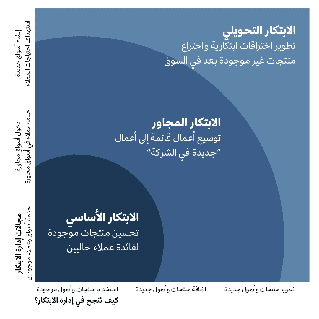 وعادة ما تكون الصعوبة الأكبر في مجال الابتكار التحويلي. إذ تُظهر دراسة أنجزتها شركة كوربوريت استراتيجي بورد (Corporate Strategy Board) أن الشركات الناضجة التي تحاول الدخول إلى مجال جديد تفشل في 99% من المحاولات. ويعكس ذلك الحقيقة الصعبة التي مفادها أن تحقيق التحول؛ أي صنع منتجات أو خدمات مختلفة، يفرض على المؤسسة أن تعمل بطريقة مختلفة، ويحتاج ذلك إلى موظفين مختلفين وعوامل تحفيزية وأنظمة دعم مختلفة. كان على الشركات التي نجحت في ذلك (جنرال إلكتريك وآي بي إم نموذجان مرموقان في هذا المجال) أن تفكر بحرص في 5 مجالات إدارية تخدم المستويات الثلاثة من الطموح الابتكاري.