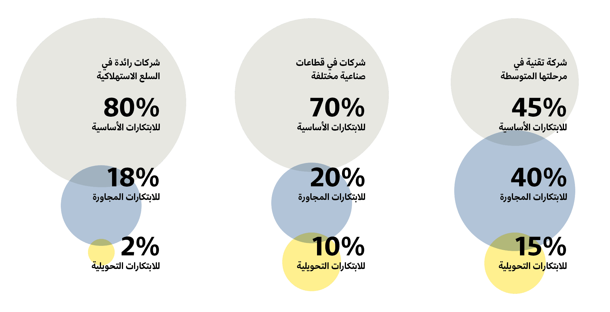 لنكن واضحين: نحن لا ندّعي أن توزيع الاستثمار في الابتكار وفقاً لنسب 70% و20% و10% هو وصفة سحرية صالحة للشركات كلها، بل هو ببساطة مجرد متوسط تخصيص للموارد يعتمد على التحليل المتقاطع لقطاعات الابتكار وجغرافيته. أما التوازن المناسب فيتنوع من شركة إلى أخرى وفقاً لعدد من العوامل (انظر الشكل التوضيحي: "طموحات مختلفة تعني تخصيص موارد مختلفة").