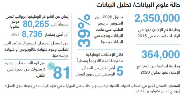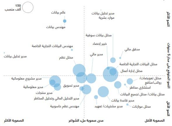 لا يخفى على أحد أن الوظائف التي تشمل علم البيانات وتحليلها تشهد تنامياً سريعاً، الأمر الذي يقود إلى نقص في الأشخاص الموهوبين. لكن هناك فروقاً ضمن هذه الفئة الواسعة وفقاً لدراسة أجراها كل من آبي بي إم، وبيرنينغ غلاس (Burning Glass)، ومنتدى التعليم العالي للأعمال (Business–Higher Education Forum). فقد وضع الباحثون الألقاب الوظيفية في مصفوفة من محورين (كما في الشكل البياني أدناه) بحسب مدى صعوبة ملء كل منصب وعدد المناصب الجديدة المتوقعة في الولايات المتحدة الأميركية في السنوات الخمس المقبلة. وقد تبين بأن مناصب عالم بيانات، ومهندس بيانات، ومدير تحليل البيانات هي الأسرع نموّاً والمناصب الأصعب من حيث إمكانية العثور على من يشغلها (علماً بأن ملأها مكلف للغاية). ويأمل الباحثون أن يسهم عملهم في تعزيز الوعي بين صفوف أصحاب العمل ومسؤولي التعليم ومسؤولي تطوير القوى العاملة بخصوص "الفجوة الوشيكة في القدرات التحليلية"، بحيث يسهم هذا الوعي في تشجيع هؤلاء الناس على تدريب المزيد من الأشخاص ليكونوا جاهزين لملء هذه المناصب التي تشهد أكبر طلب عليها.