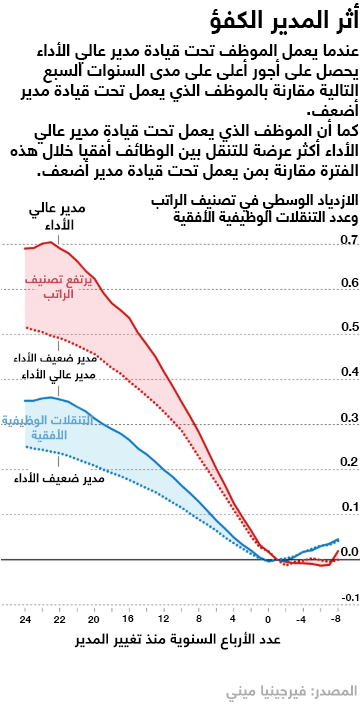 كان الموظفون الذين عملوا تحت إشراف مدير عالي الأداء أكثر عرضة بنحو 40% للتنقل بين الوظائف أفقياً داخل الشركة على مدى السنوات السبع التالية (وهذا يشمل الانتقالات من قسم خدمة العملاء إلى قسم الخدمات اللوجستية، أو من قسم ترويج السلع إلى قسم المبيعات، أو من قسم تطوير المنتج إلى قسم الجودة).