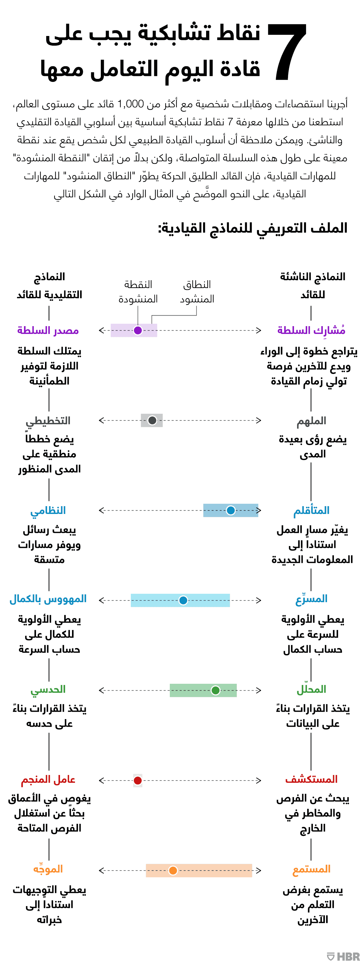 لكن الواقع الذي يعيشه قادة اليوم يفرض مستجدات أكثر تعقيداً من فكرة "التخلص من منهج قديم واتباع آخر جديد". فقد وجدنا، على سبيل المثال، أن بعض جوانب القيادة التي بدت كأنها عفاها الزمن، مثل صناعة القرار من القمة إلى القاعدة والتركيز على التنفيذ التكتيكي، كانت ذات قيمة كبيرة للتغلب على حالة الغموض التي صاحبت جائحة "كوفيد-19". وبالتالي، بدلاً من الاستقرار على نموذج أكثر ثباتاً للسلوكات الناشئة، وجدنا أن "النقاط التشابكية القيادية السبعة" بين العالمين التقليدي والناشئ كانت طريقة أكثر دقة لوصف الوضع الحالي للقيادة الفاعلة.