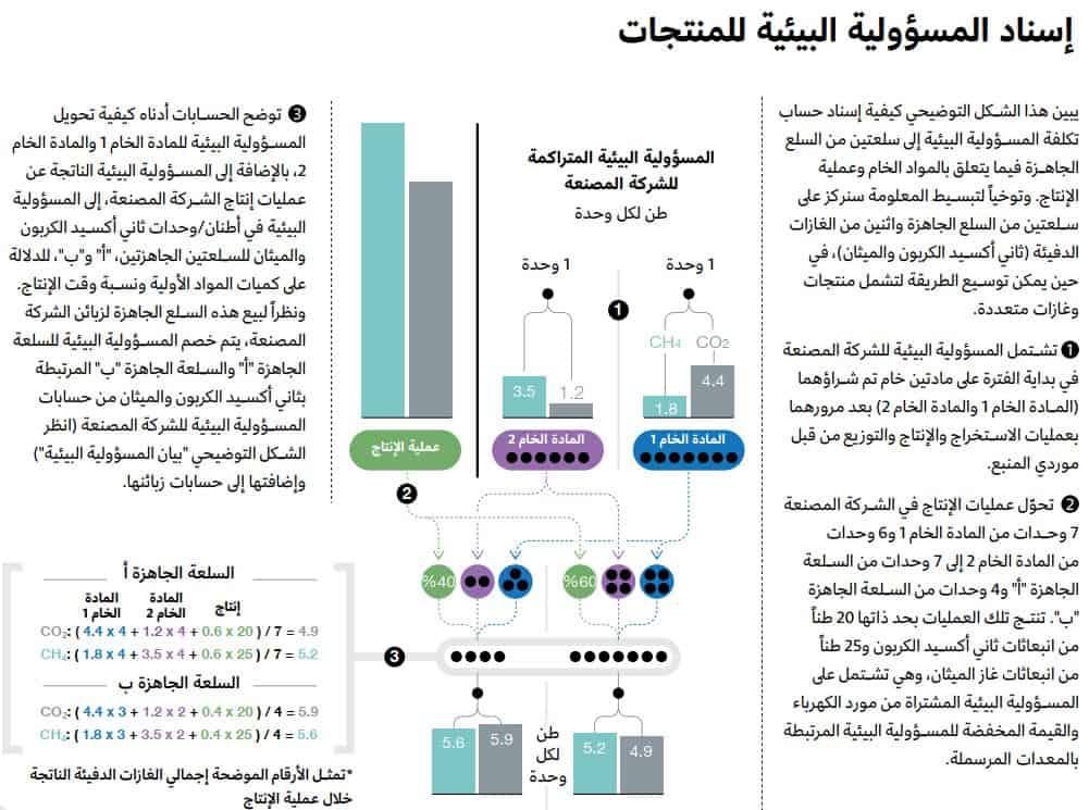 يتطلب نظام المحاسبة الجديد هذا خطوتين أساسيتين: (1) حساب صافي المسؤولية البيئية المتولدة من قبل الشركة وخصمها كل فترة، وإضافتها إلى المسؤولية البيئية المكتسبة والمتراكمة لديها، و(2) إسناد بعض المسؤولية البيئية الإجمالية أو كلها إلى وحدات الإنتاج المنتجة من قبل الشركة خلال فترة إعداد التقرير. بالنسبة للخطوة الأولى، يمكن لمهندسي البيئة تقدير كمية انبعاثات الغازات الدفيئة من أنشطة المصدر الرئيسي للشركة، مثل حرق الهيدروكربونات من أجل توليد الكهرباء والتدفئة والنقل؛ وإنتاج المعادن والإسمنت والزجاج والمواد الكيماوية؛ والأنشطة الزراعية التي تنطوي على الانبعاثات الصادرة عن مخلفات الماشية وإزالة الغابات أو إعادة تشجيرها؛ وإدارة النفايات.