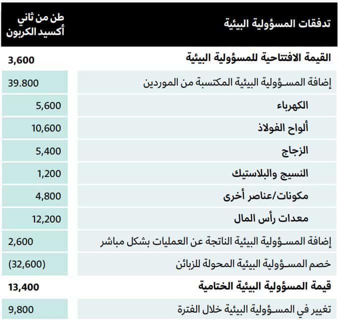 يوضح هذا الجدول التغييرات الافتراضية على المسؤولية البيئية المفروضة على شركة تصنيع أبواب السيارات خلال فترة محاسبية واحدة. يعكس الرصيد الافتتاحي المسؤولية المفروضة نسبة للإجراءات المتخذة في فترات سابقة. وتضاف الانبعاثات التي تنتجها الشركة من عملياتها وتلك المحولة إليها من مورديها، بما فيها الانبعاثات الناتجة عن استثمارات رأس المال إلى الرصيد الافتتاحي. تُطرح بعد ذلك الانبعاثات من المنتجات المشتراة من قبل مصانع تجميع السيارات، والنتيجة هي المسؤولية البيئية الختامية للشركة نهاية الفترة.