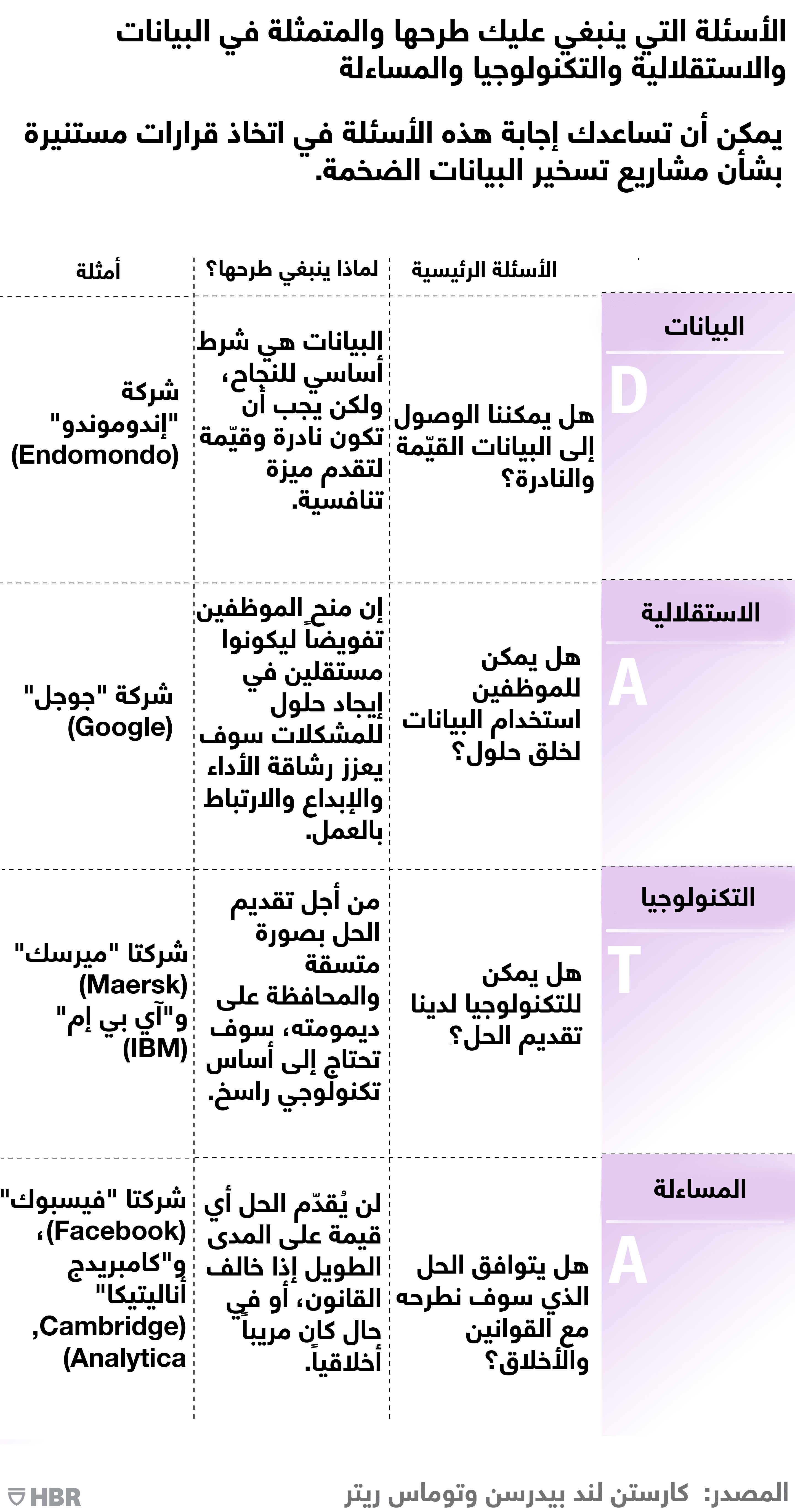 تقع المشاريع المعتمدة على البيانات الضخمة، التي تتمحور حول تسخير البيانات بغية تحسين الأعمال وتطويرها، على رأس أولويات معظم المسؤولين التنفيذيين. ومع ذلك، تواجه نسبة تصل إلى 85% منها الفشل، ويعود سبب ذلك غالباً إلى أن المسؤولين التنفيذيين لا يمكنهم تقييم مخاطر المشروع بدقة منذ البداية. لكن، نستطيع القول إنّ نجاح مثل هذه المشاريع يُحدَّد بدرجة كبيرة من خلال أربعة محاور مهمة، وهي البيانات والاستقلالية والتكنولوجيا والمساءلة (التي يقابلها بالإنكليزية الأحرف D.A.T.A)، أو ببساطة من خلال طرح أربعة أسئلة متمثلة بهذه المحاور. وقد برزت هذه الأسئلة من خلال عملنا على مشروعنا البحثي، الذي جرى على مدار أربع سنوات، حول تسويق البيانات الضخمة.