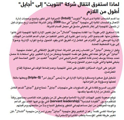 نحن نشهد اليوم تحولاً أعمق بكثير. فلماذا نشهد مثل هذا التحول الآن؟ لأن الابتكار السريع بات ضرورة استراتيجية بالنسبة لمعظم الشركات وليس مجرد مسألة ثانوية. ولتحقيق ذلك، لجأت شركات الأعمال إلى وادي التكنولوجيا "سيليكون فالي" وإلى شركات تطوير البرمجيات تحديداً وعملت على محاكاة ممارساتها القائمة على منهجية "أجايل" في إدارة المشاريع. وهكذا باتت الطرائق الأكثر خفة والقائمة على تلبية احتياجات المستخدم تحل محل نماذج التخطيط الرأسية من  القمة إلى القاعدة. يحصل هذا لأن الطرائق الجديدة أفضل ملاءمة للتكيُّف على المدى القريب والاستجابة للتغيرات، من خلال إتاحة على سبيل المثال تنفيذ نماذج أولية سريعة،  والحصول على الآراء والتقييمات بصورة متكررة تزايدية، واتخاذ القرارات على أساس الفريق، والعمل ضمن فترات زمنية قصيرة أو "سبرنتس" (sprints) مع التركيز على إنجاز المهمة المحددة. عن ذلك تقول مديرة التحول لدى بنك مونتريال لين روجر إن "السرعة هي العملة الجديدة في قطاع الأعمال".
