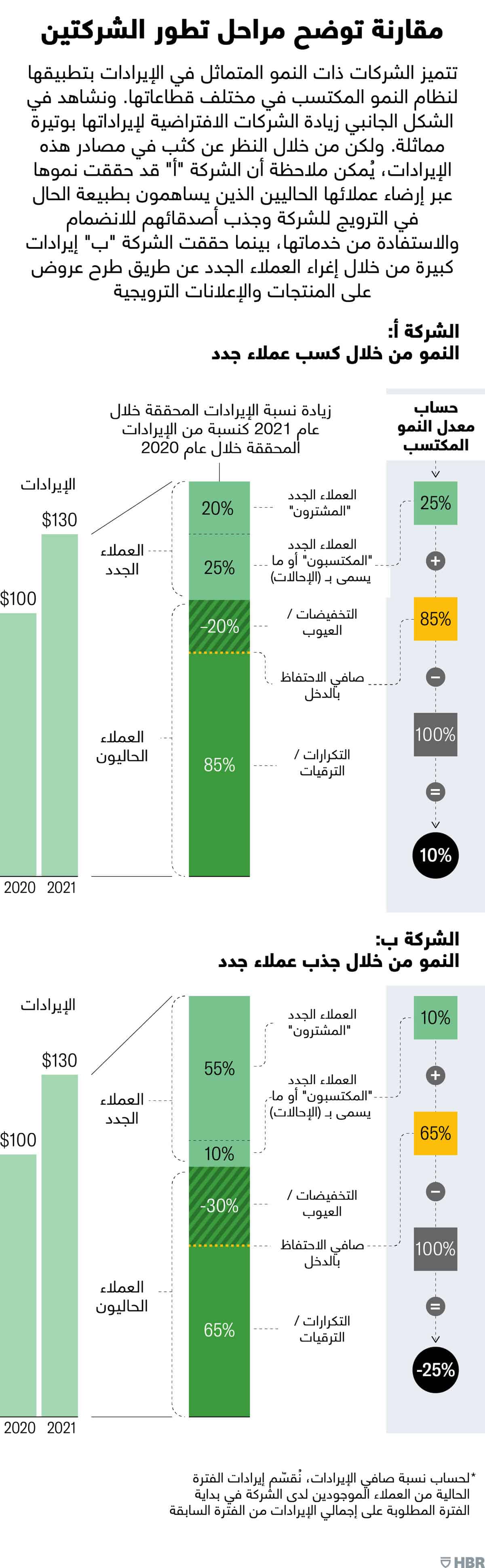 لتحديد معدل النمو المكتسب، اجمع قيمة صافي الاحتفاظ بالإيرادات والعملاء الجدد المكتسبين معاً ثم اطرح الناتج من 100%. دعونا نلقي نظرة على مثال هنا، نمت إيرادات الشركة "أ" من 100 دولار أميركي في عام 2020 إلى 130 دولاراً أميركياً خلال عام 2021، أي ما يعادل 30% نمو خلال عام واحد. وحقق العملاء المسجلين في عام 2020 إيرادات قدرها 85 دولاراً، إذ قام بعضهم بتوسيع مشترياتهم بما يصل مجموعه إلى 5 دولارات، ولكن هذا النمو شهد زيادة أكبر من قبل العملاء الآخرين الذين وصلت مشترياتهم إلى 20 دولاراً، ما أدى إلى تحقيق نمو في صافي الاحتفاظ بالإيرادات بمعدل 85%. في المحصلة نجد أن العملاء الجدد استحوذوا على 45 دولاراً أميريكياً من الإيرادات، بينما استحوذ العملاء الجدد المكتسبين (الإحالات) على 25 دولاراً أميركياً، واستحوذ العملاء الجدد الذين تم شراؤهم على 20 دولاراً أميركياً. ومن خلال جمع نسبتي "صافي الاحتفاظ بالإيرادات" (85%) و"كسب عملاء جدد" (25%)، ثم طرح (100%) نحصل على معدل النمو المكتسب والذي تصل نسبته في هذا المثال إلى 10%.