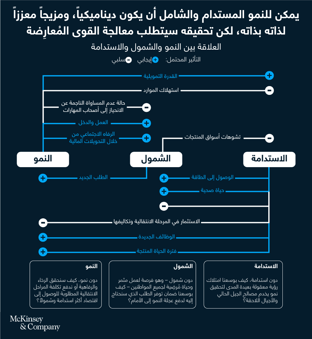 - يسهم توفير قدر أكبر من الشمول والاستدامة في تعزيز النمو من خلال الطلب الجديد والفرص الاستثمارية. إذ توفّر الاستدامة فرصاً تجارية جديدة في مجالات مثل الطاقة النظيفة. بمقدور الهند، على سبيل المثال، مضاعفة قدراتها في مجال الطاقة المتجددة أكثر من أربع مرات بحلول عام 2030؛ وتشير تقديراتنا إلى أن ذلك يمكن أن يزيد حجم الناتج المحلي الإجمالي بمقدار 90 مليار دولار وأن يدعم ما يقرب من مليوني فرصة عمل في 2030. ويمكن للشمول أن يترك آثاراً قوية مشابهة على النمو، حيث تدلّ توقعاتنا على أن توفير إمكانية الحصول على الرعاية الصحية بطريقة أشمل للناس يمكن أن يزيد من نمو الناتج المحلي الإجمالي للعالم بمقدار 0.4% بحلول 2040. أما على نطاق أوسع، فإن الشمول يعزز الطلب، بما أن الطبقة الوسطى الآخذة بالظهور والنمو تشكّل محفزاً أساسياً للطلب. تضم أفريقيا ما يقرب من 200 مليون إنسان في عمر العمل، وسيصل عدد أفراد هذه الفئة إلى ما يقرب من مليار شخص بحلول 2050. ويمكن لتدريب الشباب وتطويرهم، وتحديداً في مجال المهارات الرقمية، أن ينقل هذه المجموعة إلى صفوف الطبقة الوسطى، ويمكن أن يساعد في سد الفجوة في مجال المهارات في بقية أنحاء العالم.