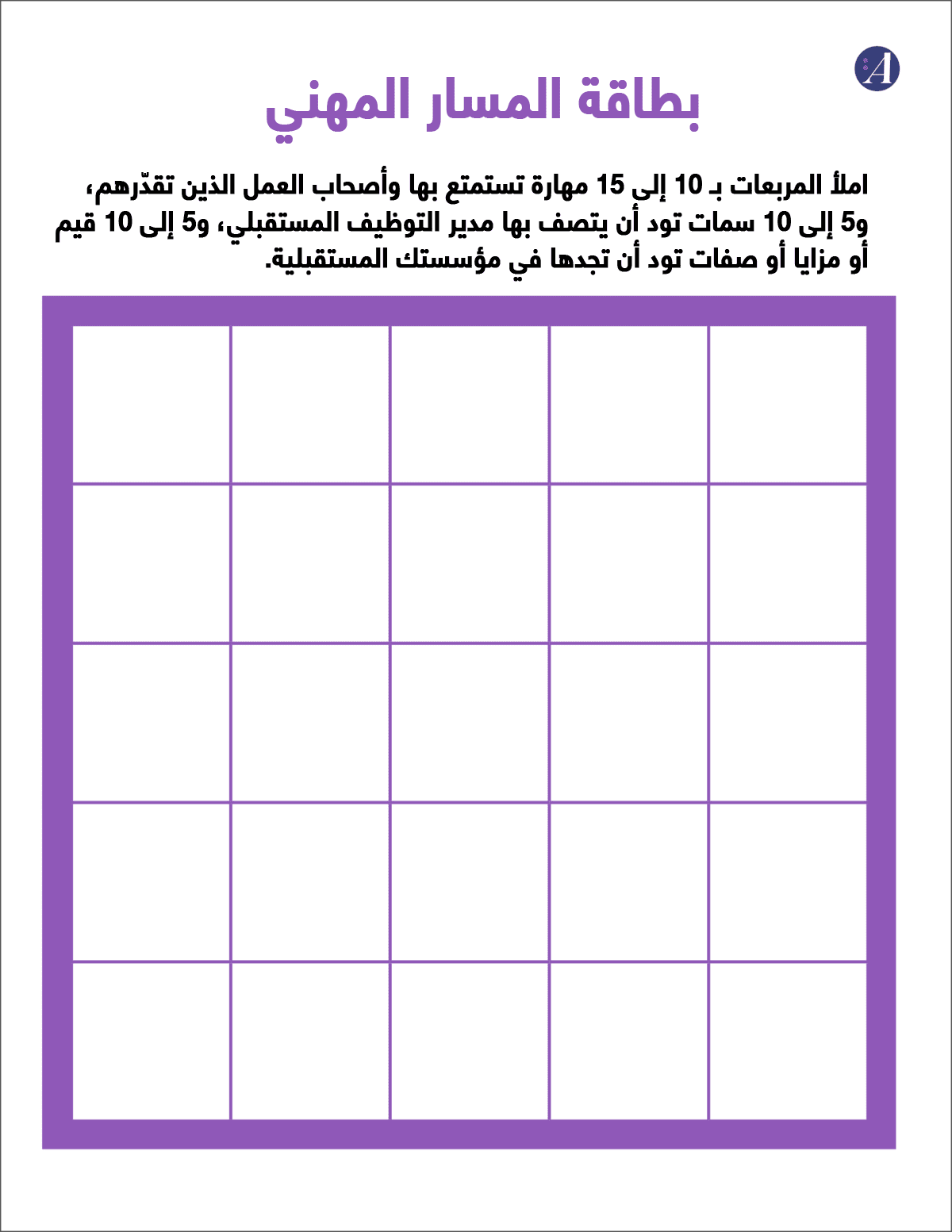 قد لا يكون لديك هدف نهائي أو وظيفة مثالية حتى الآن، ولا بأس في ذلك. ولهذا السبب من المفيد إجراء هذه العملية. عندما تفكر في الأدوار التي يمكنك أن تتقدم بطلب لشغلها، يمكنك العودة إلى بطاقة بينغو التي أعددتها لمساعدتك على تحديد ما قد يكون مناسباً لك.
