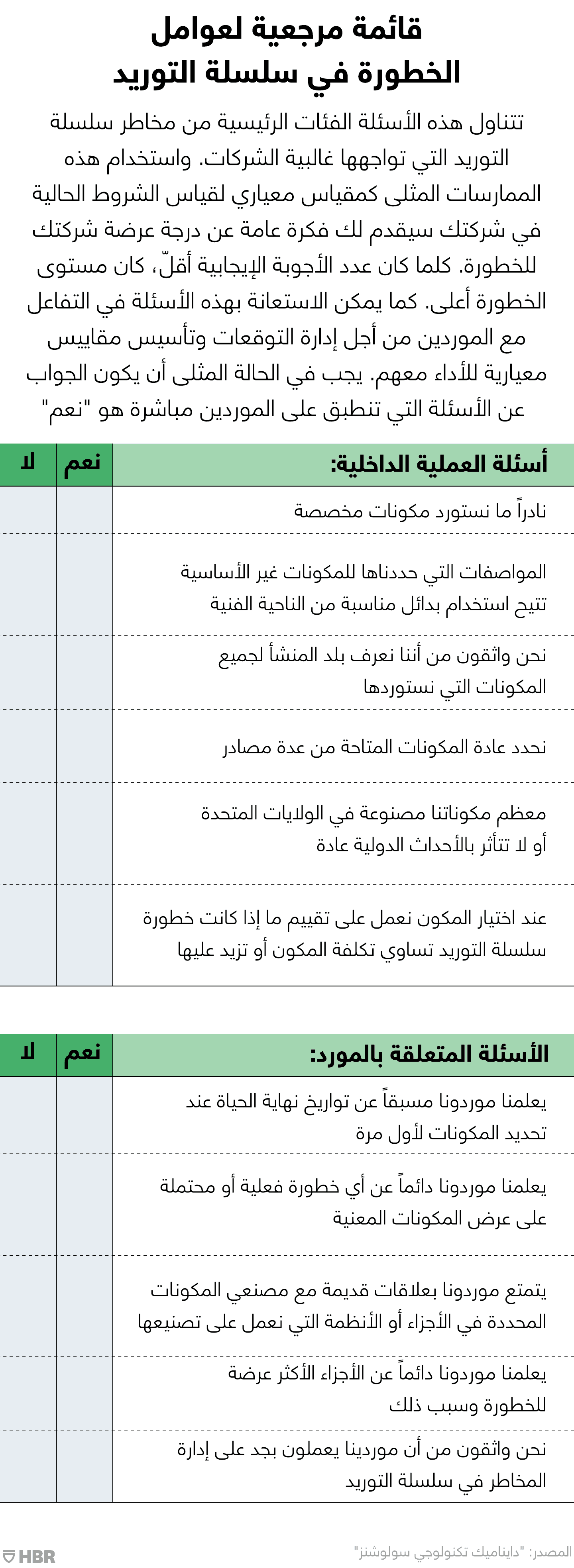 استشر مورديك في مراحل تصميم المنتج والمواصفات كي تتمكنوا معاً من إنشاء مرونة سلسلة التوريد منذ البداية. ينبغي أن تطالب الموردين بالالتزام بقائمة مرجعية مفصلة لعوامل الخطورة والمسؤوليات ذات الصلة في كل عرض أسعار يقدمونه (انظر الشكل التوضيحي بعنوان "قائمة مرجعية لعوامل الخطورة في سلسلة التوريد")، فذلك سيمنح شركتك الخيار في تحمل هذه المخاطر أو مشاركتها أو رفضها أو تعديلها. يمكن أن تشمل عوامل الخطورة بلد المنشأ للمكونات الفردية للجزء أو النظام المعني، وتاريخ انتهاء عمر المنتج، ومدة شراكة المورد مع الشركة المصنّعة لمكونات معينة في الجزء أو النظام.