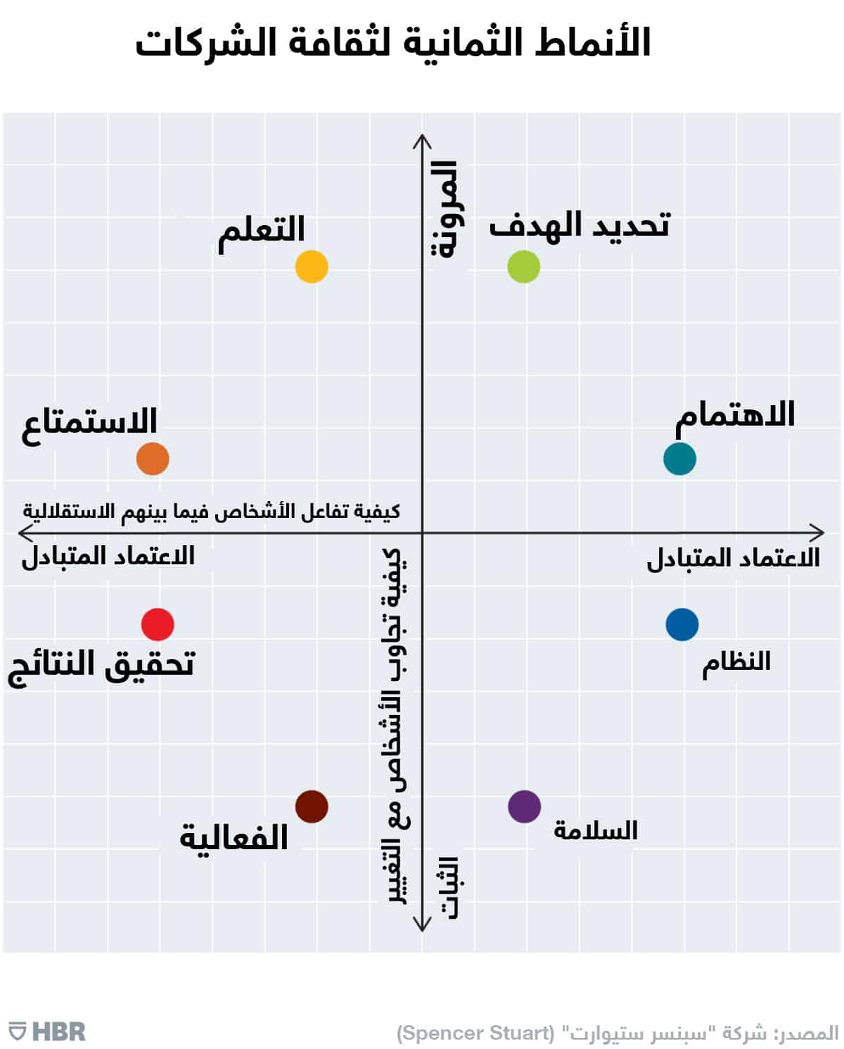 وقد منحنا هذا التقييم فرصة لسبر أغوار الثقافات المؤسسية لدى قراء "هارفارد بزنس ريفيو"، المتمثلة في السلوكيات والأعراف المشتركة والسائدة والدائمة والكامنة التي تتغلغل في المؤسسة (وليس الأنماط الثقافية الخاصة بالموظفين كل على حدة). ودرسنا، في كل مؤسسة من مؤسسات المشاركين في التقييم، الترتيب النسبي لثمانية أنماط متباينة من أنماط الثقافة التي تندرج وفق بُعدين هما: كيفية استجابة الأشخاص للتغيير (المرونة في مقابل الثبات)، وكيفية تفاعل الأشخاص فيما بينهم (الاستقلالية في مقابل الاعتماد المتبادل).