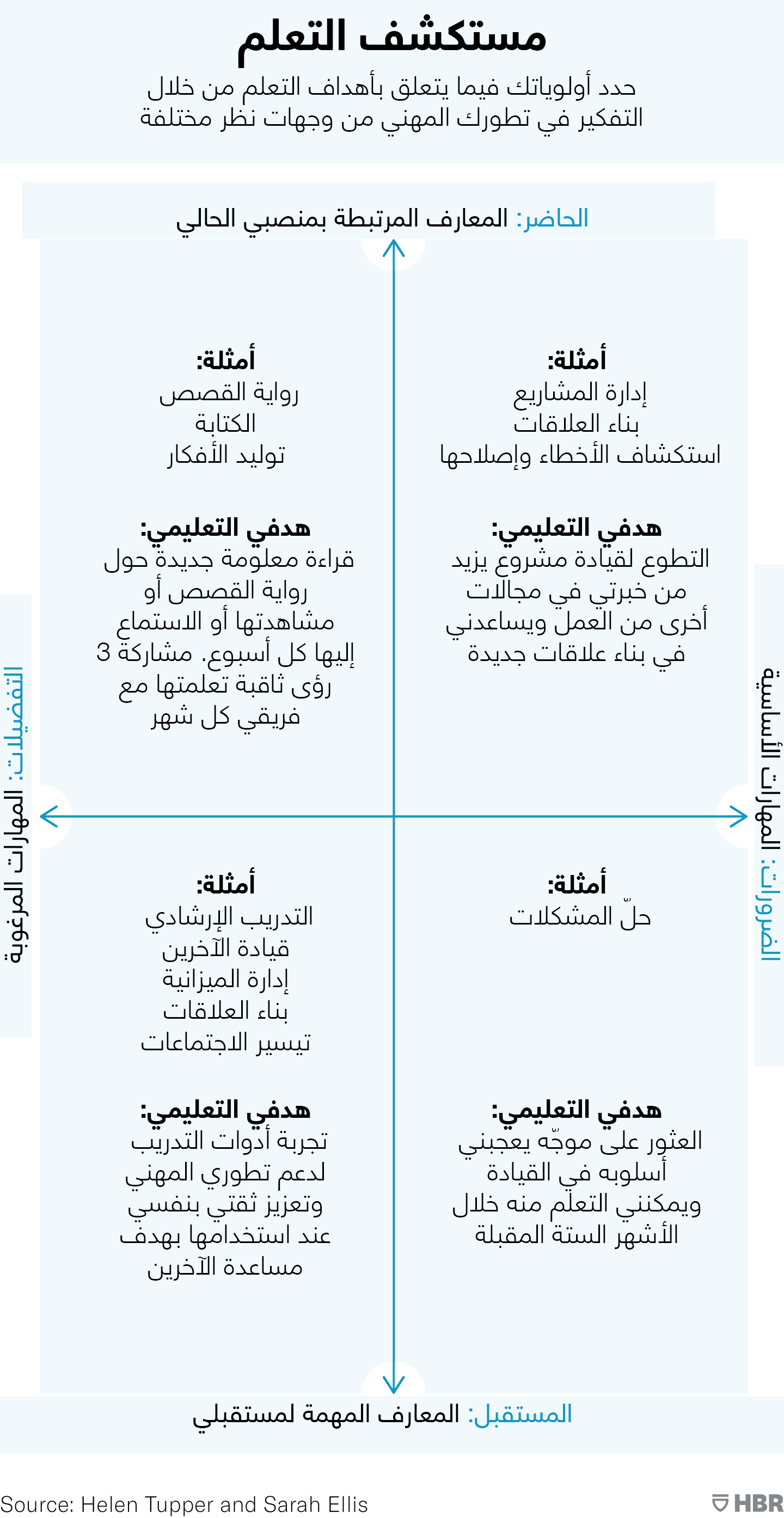 تساعدك نتيجة مستكشف التعلم على إعطاء الأولوية للمهارات التي تنتج عند تقاطع بُعدي "الحاضر" و"الضرورات" أعلى اليمين وعلى تحديد أهداف التعلم والمهارات الضرورية في منصبك اليوم و المهارات التي قد تفيد مسارك المهني في المستقبل. كما أنها تساعدك على اكتشاف المهارات المشتركة عبر الأرباع، وتحديد نقطة الانطلاق.