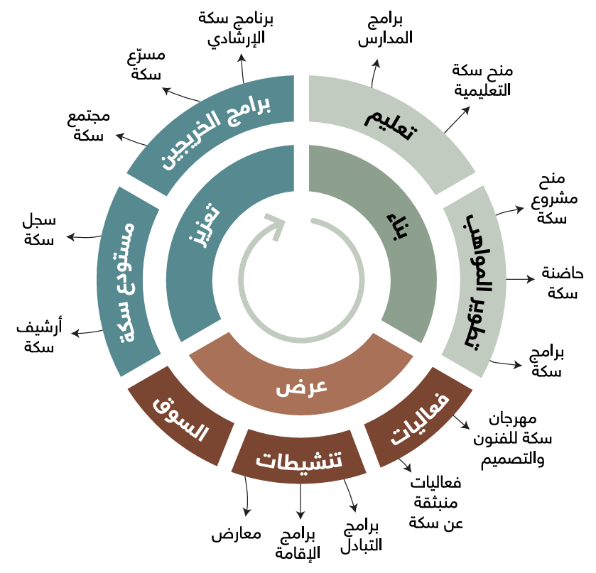 تعتمد المنصة على 3 ركائز أساسية: بناء القدرات، وإبراز المواهب، واستدامة النمو. وقد طورت المصممة والمقيّمة الإماراتية للتصميم، كاملة العلماء، استراتيجية المنصة بالتعاون مع الجهات المنوطة بمنظومة الإبداع في دبي، وعلى رأسها مؤسسات مثل مركز تشكيل ومعرض آرت دبي ومؤسسة السركال للفنون ومركز جميل للفنون. وقد تفاعل نحو 6 آلاف مستفيد مع منصة سكة منذ توسعها، وعزّزت مبادراتها المسارات المهنية للعديد من المبدعين الشباب. ومن خلال أكثر من 1,000 برنامج لتنمية المواهب قدمتها المنصة بين عامي 2022 و2024، اكتسب المشاركون المهارات وتلقوا الإرشادات وأُتيحت لهم فرص عرض أعمالهم، وهي عوامل بالغة الأهمية للنجاح. يمثل الشكل التالي عروض منظومة سكة فيما يتعلق بدورات تعلم المبدعين ونموهم.