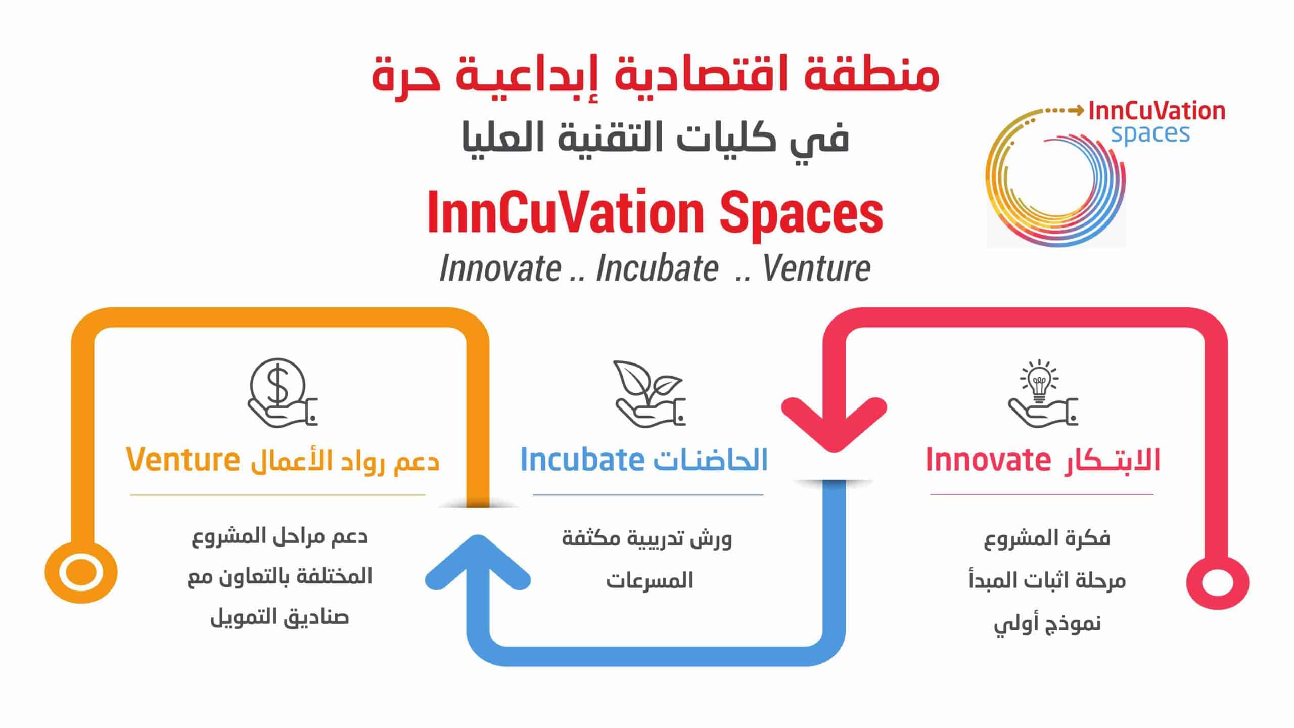 وتنفيذاً للدور التحولي لكليات التقنية نحو تخريج الشركات ورواد الأعمال واستناداً الى رؤية وجاهزية مسبقة، دشنت الكليات في نفس العام 2019 أول "منطقة اقتصادية إبداعية حرة" بفرعها في دبي، الذي أعقبه افتتاح منطقتين أيضاً في فرعيها بالشارقة ورأس الخيمة، وحملت هذه المناطق مسمى (InnCuVation Spaces)، وهي اختصار لثلاث كلمات "Innovate – Incubate – Venture" تعكس باختصار دور المناطق الاقتصادية في تطوير الأفكار المبتكرة واحتضان هذه الأفكار ومن ثم تحويلها إلى مشاريع.