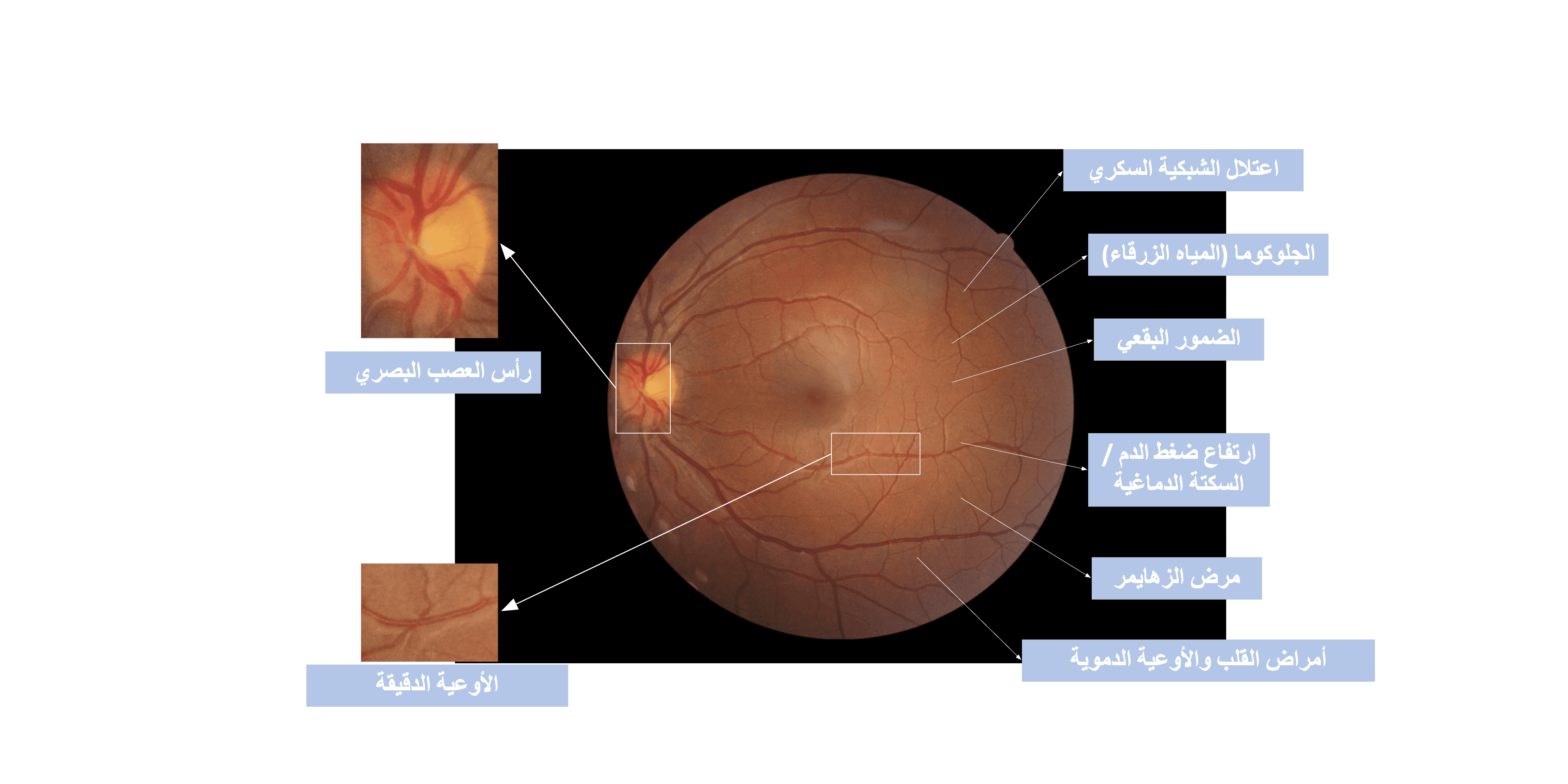 ويعد النظام اللبنة الأولى لإطلاق القوى الكامنة للدمج بين الإنسان والآلة، إذ أن العين مرآة لأمراض مزمنة يمكننا تطبيق الذكاء الاصطناعي من التنبؤ بها مثل الشكل رقم 7.