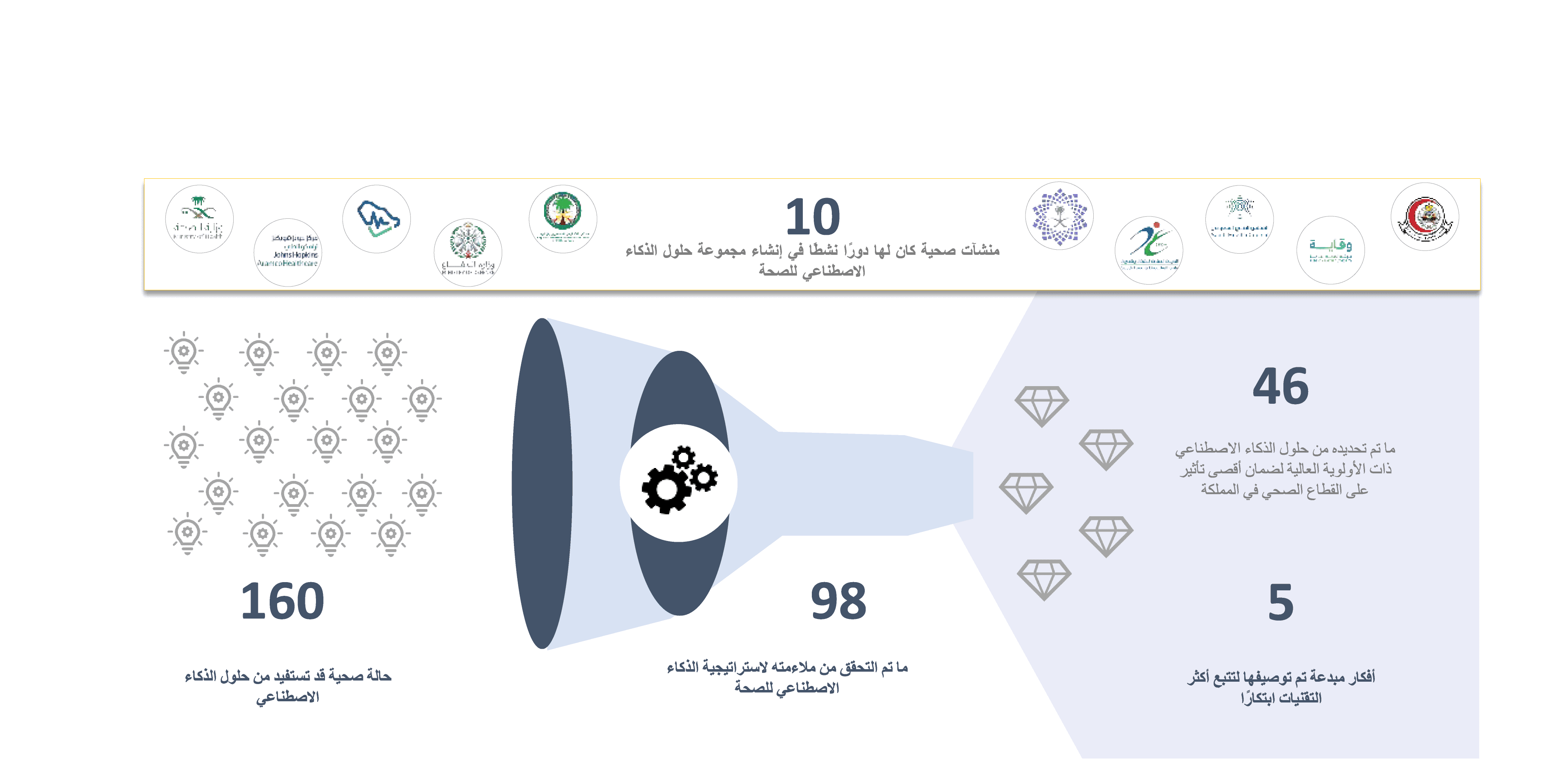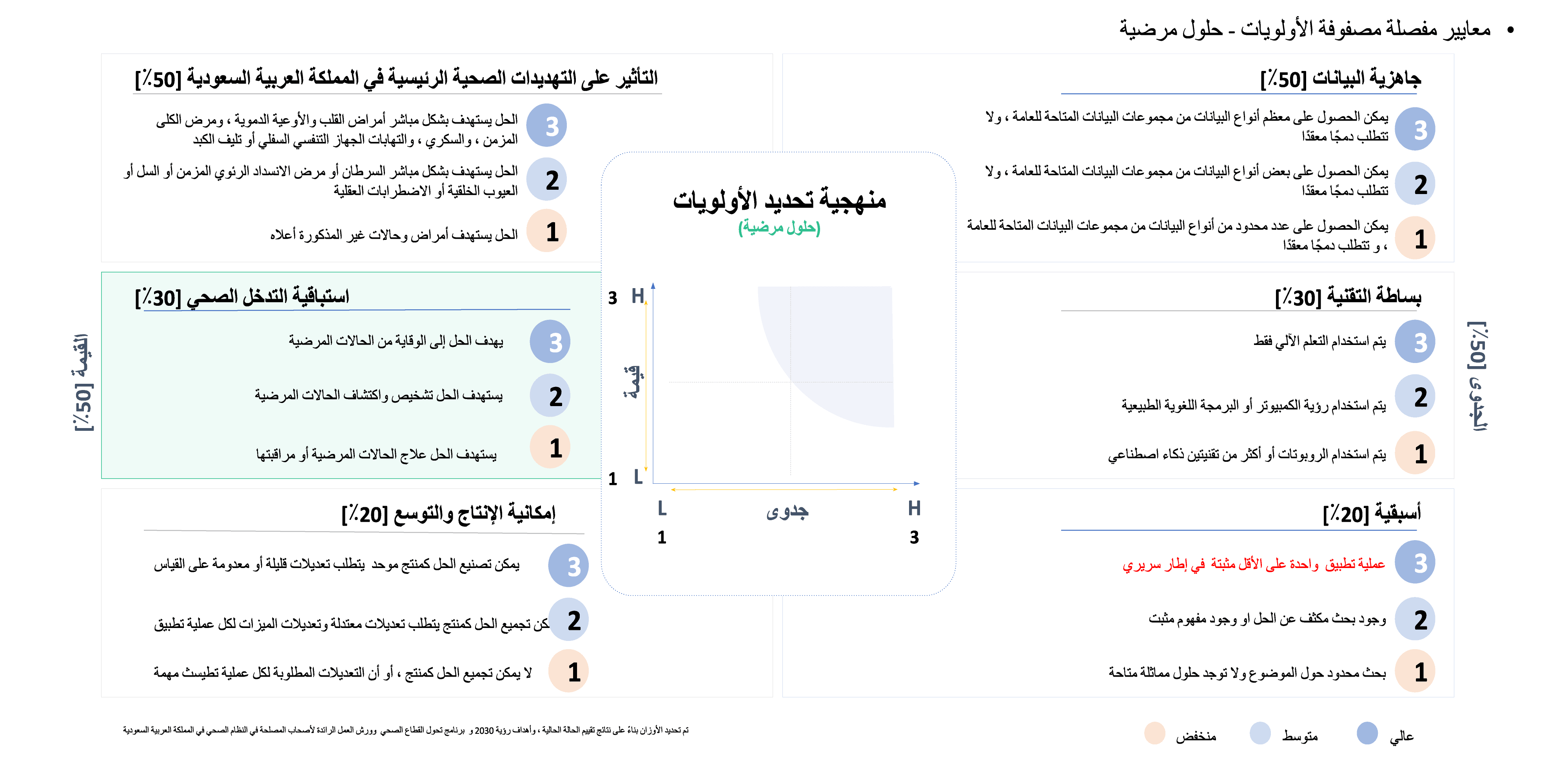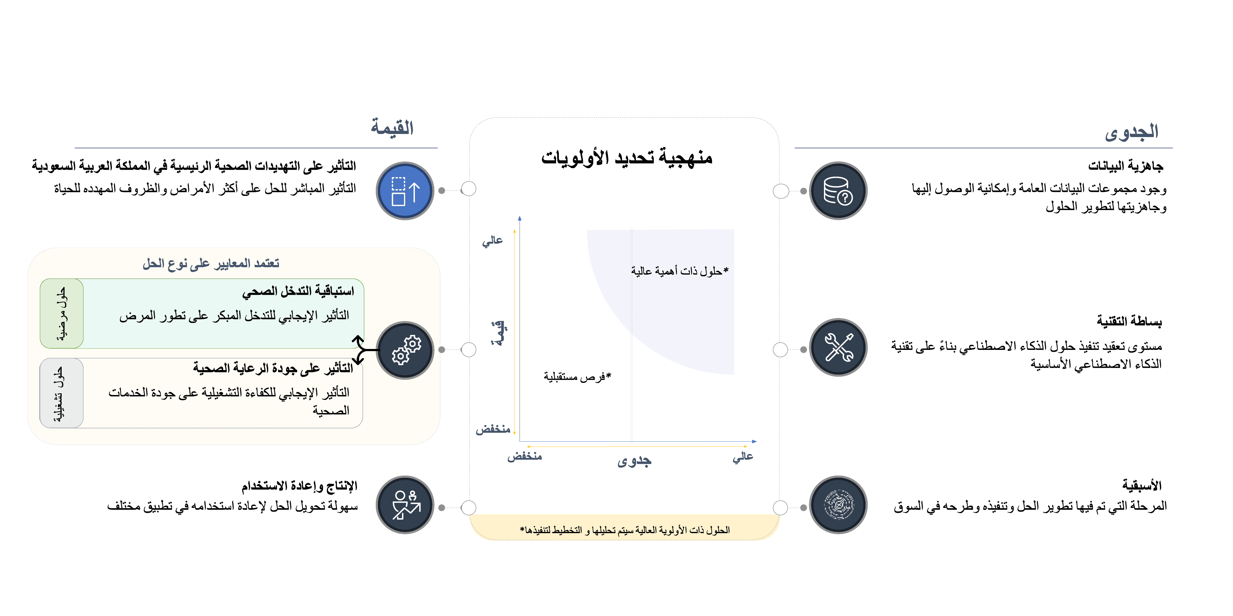 يواجه قطاع الصحة تحديات كثيرة للغاية. وهنا تكون الخطوة الأولى التي يجب اتخاذها هي تصفية التحديات وفقاً للأولوية. واستطاع قطاع الصحة في المملكة تحديد الأولويات عبر منهجية منظمة لتحديد أولويات حلول الذكاء الاصطناعي، من خلال عقد ورش عمل مكثفة بمشاركة عدد من الجهات الصحية والجهات ذات العلاقة لمناقشة التحديات التي تواجهها، وطرح قائمة شاملة بالقضايا الصحية التي تحتاج إلى حلول الذكاء الاصطناعي، ومن ثم تحديد أولويات الحلول المقترحة التي تم التحقق من صحتها بناءً على القيمة المضافة لقطاع الصحة ودراسة جدوى تنفيذها.