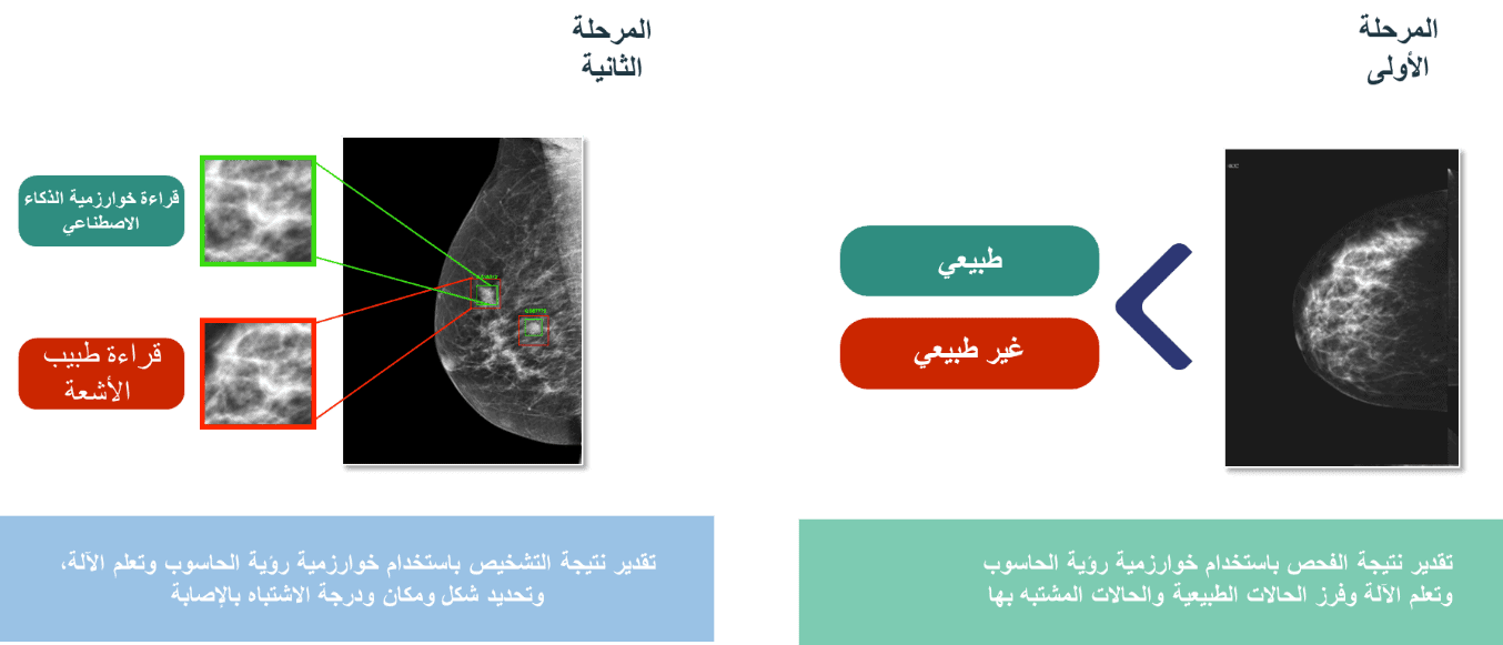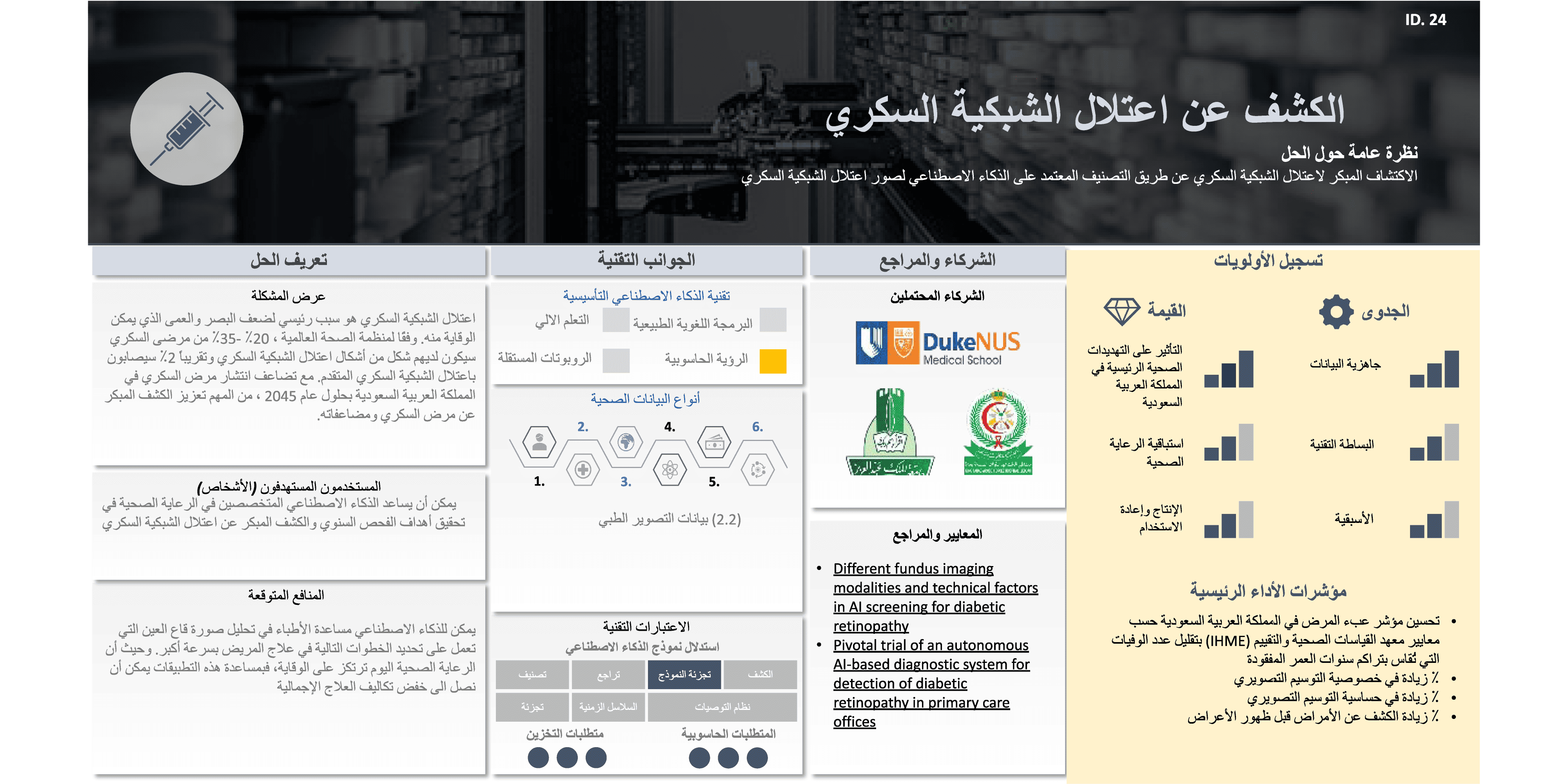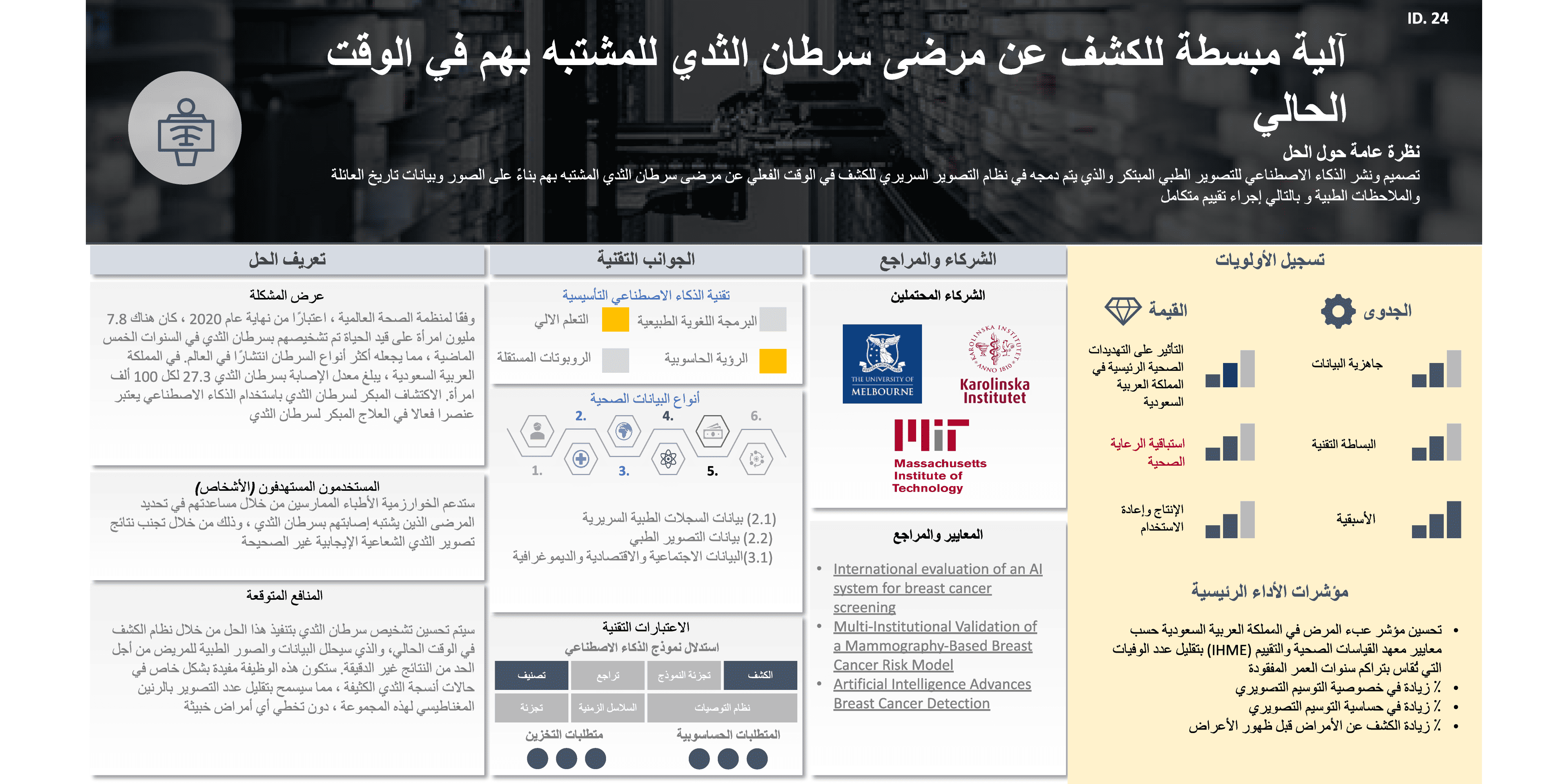 المنتج المطوّر هنا لحالة الكشف المبكر عن سرطان الثدي واعتلال شبكية العين السكري يعمل على فرز الصور وترتيبها إلى مشتبه به أو حميد بناءً على احتمال وجود عناصر مشبوهة في الصورة ما يسمح بفحص الصور التي قد تكون مريبة أولاً، مستهدفاً زيادة عدد الفحوصات بنسبة لا تقل عن 100% وخفض التكاليف العلاجية بنسبة لا تقل عن 20%، وتقليل نسبة الوفيات بسرطان الثدي من 27% إلى 20%، ما يوفر 2.5 مليار ريال في حالة سرطان الثدي و165 مليون ريال في اعتلال الشبكية للعين السكري.