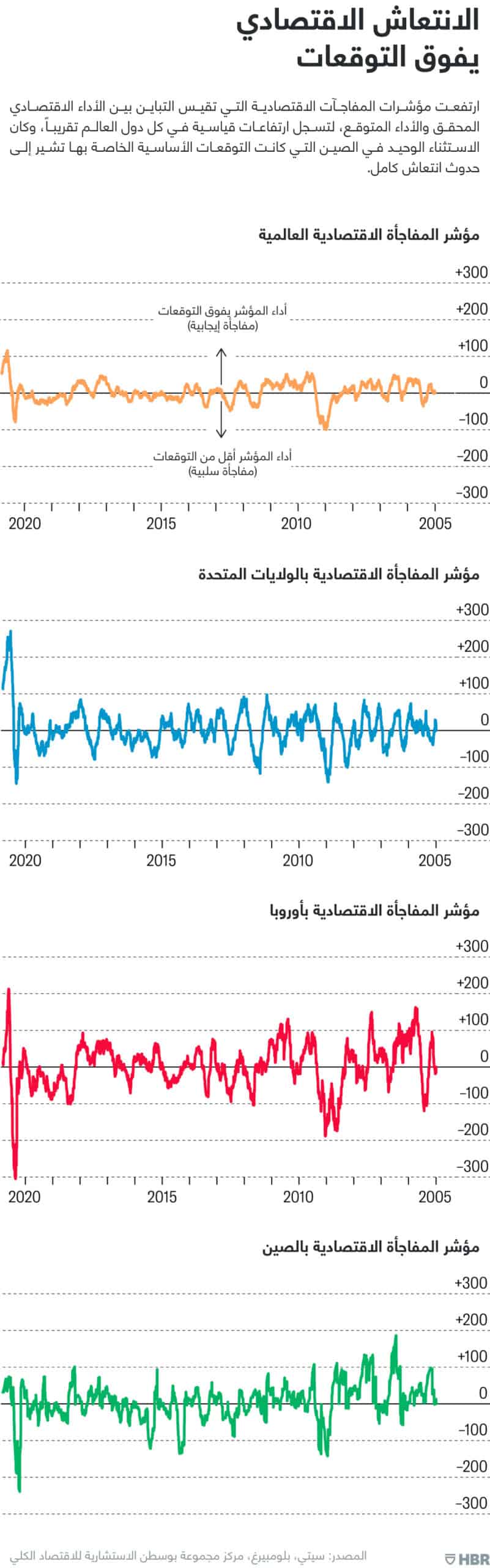 وقد تكررت هذه الأنماط في مختلف أنحاء العالم، حيث ارتفعت مؤشرات المفاجآت الاقتصادية التي تعكس التباين بين الأداء الاقتصادي المحقق والأداء المتوقع، لتسجل ارتفاعات قياسية في كل دول العالم باستثناء الصين التي كانت التوقعات الأساسية الخاصة بها تشير إلى حدوث انتعاش كامل.