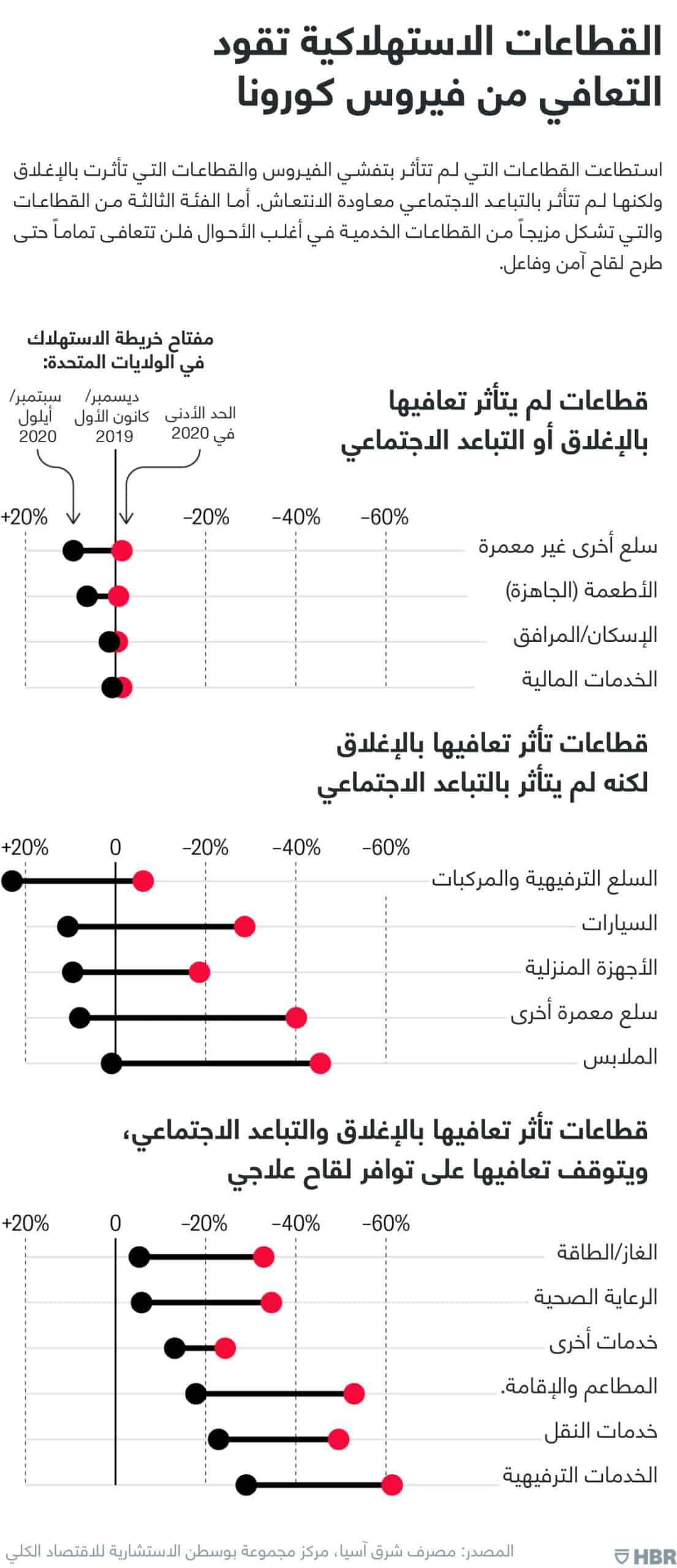 إذا ما ألقينا نظرة فاحصة على قطاعات الاقتصاد الأميركي، يمكننا تقسيمه إلى 3 قطاعات تأثرت بدرجات مختلفة تماماً نظراً لطبيعة الركود الناجم عن الفيروس. يشير هذا إلى استنفاد المرحلة "السهلة" من التعافي: