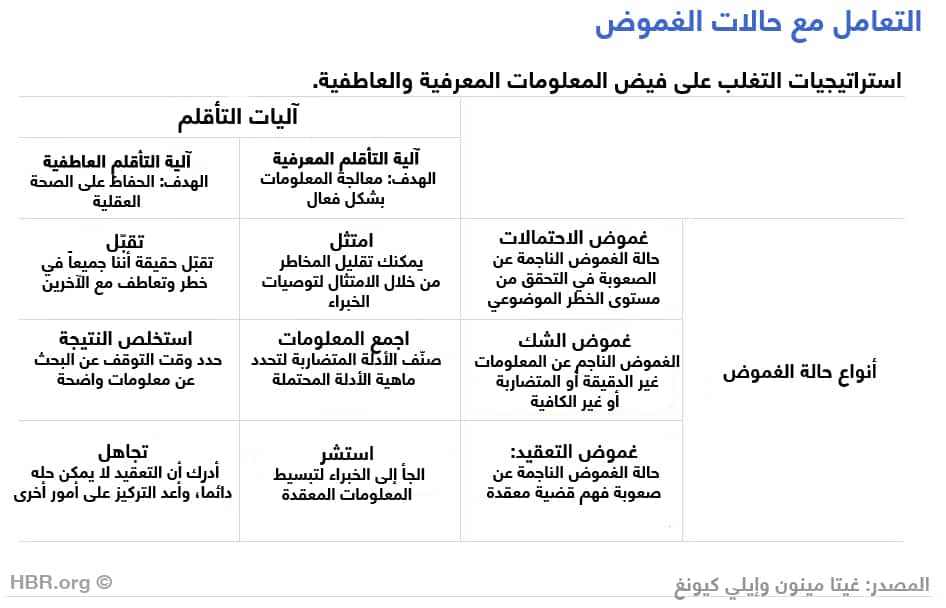 أولاً، من المهم أن نفهم أن حالة الغموض متعددة الأبعاد. ويوجد ثلاثة أنواع على الأقل من الغموض، ألا وهي غموض الاحتمالات وغموض الشك وغموض التعقيد. وللتعامل مع كل نوع من أنواع الغموض، حددنا العديد من الاستراتيجيات المعرفية (لمعالجة المعلومات بشكل أكثر فاعلية وفهم المعلومات) والاستراتيجيات العاطفية (للتخفيف من مشاعر التوتر والقلق الناجمين عن حالة الغموض).
