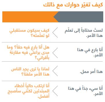 عندما نصبح بارعين أو ممتازين في أداء بعض الأشياء، فإنّنا نادراً ما نرغب بالعودة إلى حالة نجد أنفسنا فيها "غير بارعين" في أشياء أخرى. نعم، لقد تعلّمنا الآن بأنّ علينا اعتناق فلسفة التجريب و"الفشل السريع" في العمل. لكنّنا تعلّمنا أيضاً بأنّنا يجب أن نستفيد من نقاط قوّتنا. وبالتالي فإنّ فكرة أن نكون سيئين في شيء ما لأسابيع أو أشهر؛ وأن نشعر بأننا في وضع غريب وبطيؤون؛ وأننا مضطرون إلى طرح "أسئلة غبية" أو الشعور بأننّا لا نفهم ما يُقال أمامنا؛ والحاجة إلى تلقّي التوجيهات بخصوص كيفية التعامل مع كلّ خطوة في العمل مراراً وتكراراً، هي فكرة مرعبة للغاية. لكنّ المتعلّمين البارعين يسمحون لأنفسهم بأن يكونوا في حالة من الضعف الكافي لهم لكي يقبلوا هذه الحالة التي يجدون أنفسهم فيها كأشخاص مبتدئين. لا بل يمكن القول بأنّهم يمكن أن يشعروا بقدر معقول من الارتياح وهم في هذه الحالة، من خلال التحكّم بحوارهم مع ذاتهم والذي يدور بينهم وبين أنفسهم.