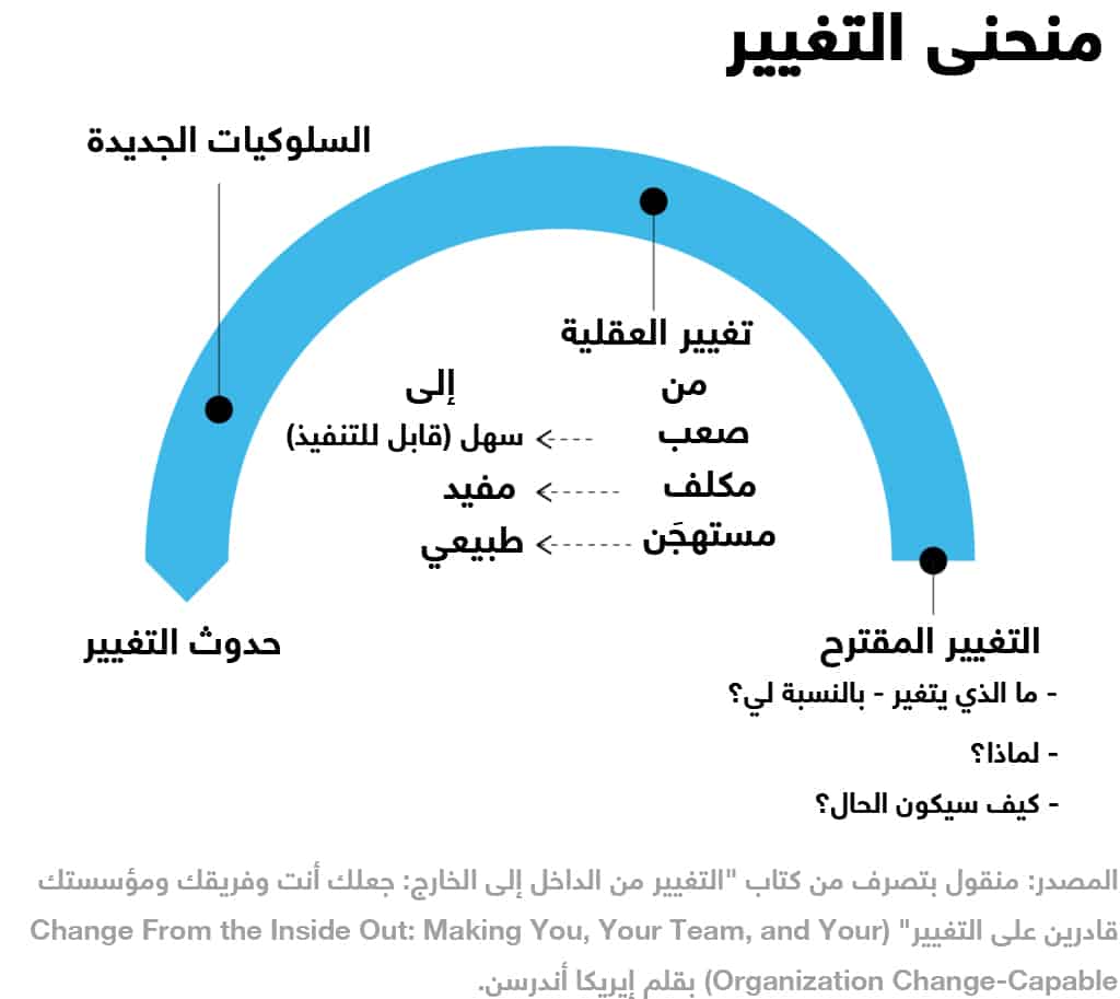 ومن الأهمية بمكان أن تتذكر كقائد أنك حينما تعلن لموظفيك عن التغيير المنشود، فإنك قد أخذت ما يكفيك من الوقت للمرور بكافة مراحل منحنى التغيير، لكننا غالباً ما نتوقع من موظفينا أن يقبلوا التغيير من تلك اللحظة كما قبلناه نحن بعد شهور من التفكير والتساؤل وتغيير عقليتنا.