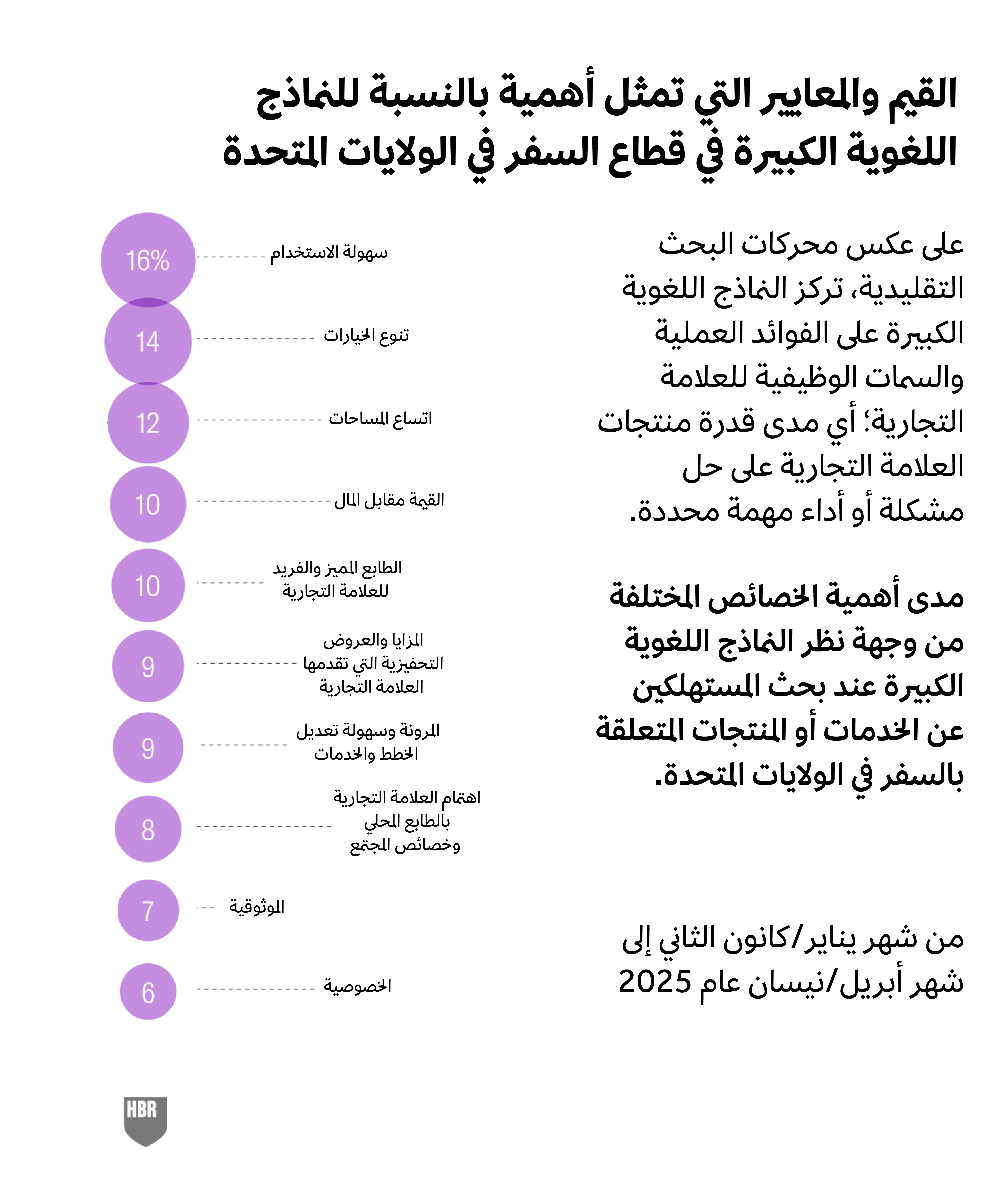 على سبيل المثال، لنعد إلى قطاع السفر في الولايات المتحدة، مع التركيز على تصور النماذج اللغوية الكبيرة لمنصة إير بي إن بي، ففي حين يركز نموذج لاما على تميز العروض التي تقدمها العلامة التجارية، ينصب تركيز نموذج تشات جي بي تي على مدى توفير العلامة التجارية لخيارات مرتبطة بالمجتمع المحلي، أما نموذج بيربليكسيتي، فيركز على معيار المرونة أكثر من القيم والمعايير الأخرى.