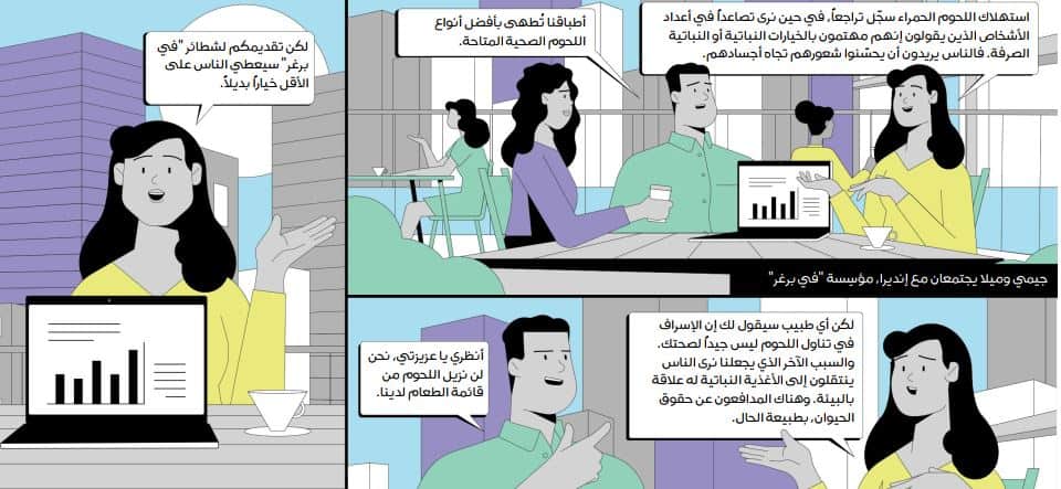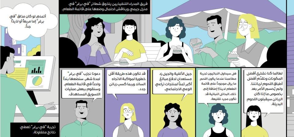 "لطالما كنا نشتري أفضل المكونات ونقدّم أفضل أطباق اللحوم لزبائننا.6 لا شك أن أعداد النباتيين تتزايد، لكن الأمر لم يُحسم بعد بخصوص ما إذا كان الزبائن، وحتى النباتيون منهم، سيتقبّلون اللحوم البديلة".