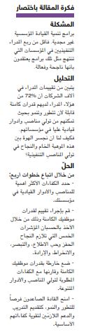 تُخفق غالبية المؤسسات حول العالم في أحد المقاييس الأساسية للنجاح ألا وهو تنمية القيادات. وبحسب بحث أجرته شركة "كوربوريت إكزيكوتيف بورد" Corporate Escutive Board-(CEB)، فإن 66% من الشركات تستثمر في برامج تهدف إلى اكتشاف الموظفين ذوي القدرات الكامنة العالية ومساعدتهم في التطور والنمو، غير أن نسبة 24% فقط من كبار المدراء التنفيذيين في تلك الشركات ينظرون إلى هذه البرامج بوصفها ناجحة. وإن نسبة صغيرة من هؤلاء المدراء لا تتعدى 13% يثقون في قادتهم الصاعدين، بعدما كانت تلك النسبة قد بلغت 17% منذ ثلاث سنوات فقط، وهي نسبة متدنية أصلاً. وفي كبريات الشركات في العالم –التي توظف كل منها آلاف المدراء التنفيذيين- يجري توظيف 30% من المدراء الجدد من خارج تلك الشركات.