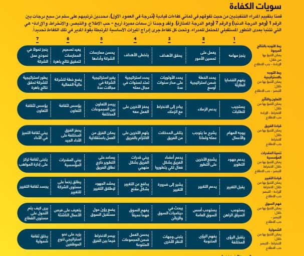 ومن الضروري بالنسبة لمؤسستك أن تسعى على نحو مماثل إلى تحديد الكفاءات الأهم لشغل المناصب القيادية العليا فيها في ضوء التحديات الخاصة التي تواجهها والأهداف التي تضعها. ونقترح تحديد مستوى المهنية المطلوب في كل كفاءة بالنسبة لكل دور أو منصب على مقياس مدرج من 1 إلى 7. (لمزيد من الشرح المفصل لكيفية تحويل مستوى المهارات إلى أرقام، انظر العرض التوضيحي: "سويات الكفاءة"). وعادة ما تتطلب مناصب السويات القيادية العليا تسجيل الرقم 4 على الأقل في الكفاءات المهمة لهذه المناصب، أما بالنسبة لمنصب الرئيس التنفيذي فمن الضروري تسجيل الرقم 5 على الأقل.