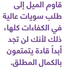 طلب سويات عالية في الكفاءات كلها، ذلك لأنك لن تجد أبداً قادة يتمتعون بالكمال المطلق. وفي دراسة أجريناها بالتعاون مع شركة "ماكنزي"، لأكثر من 5,000 مدير تنفيذي في 47 شركة، وجدنا أن 1% فقط حققوا متوسط كفاءة مهنية بلغت الرقم 6 أو أكثر، وأن 11% منهم فقط أحرزوا الرقم 5. ولذا، فحتى بالنسبة لأعلى المناصب الإدارية، يتعين عليك أن تسعى إلى إحراز سويات فوق المتوسط في معظم الكفاءات ورقماً مميزاً في اثنتين أو ثلاث منها.