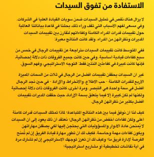 كانت من بين السيدات المختارات السيدة "ص" وهي في الثلاثينات من عمرها وتتولى مهام محددة في مجال التخطيط. وبفضل ما تتمتع به من سويات عالية في سمتَي حب الاطلاع والانخراط، حصلت على تقييم وسطي مرتفع لكفاءاتها الكامنة بلغ الرقم 4.7، على الرغم من انخفاض متوسط تقييم كفاءاتها الحالية والذي لم يتجاوز الرقم 2.6؛ حتى إنها في بعض الكفاءات - كالتوجه الاستراتيجي، وتنمية المقدرات المؤسسية - لم تحقق الشروط المطلوبة لشغل المنصب الأعلى مباشرة من منصبها الحالي، فما بالك بالمناصب القيادية العليا.