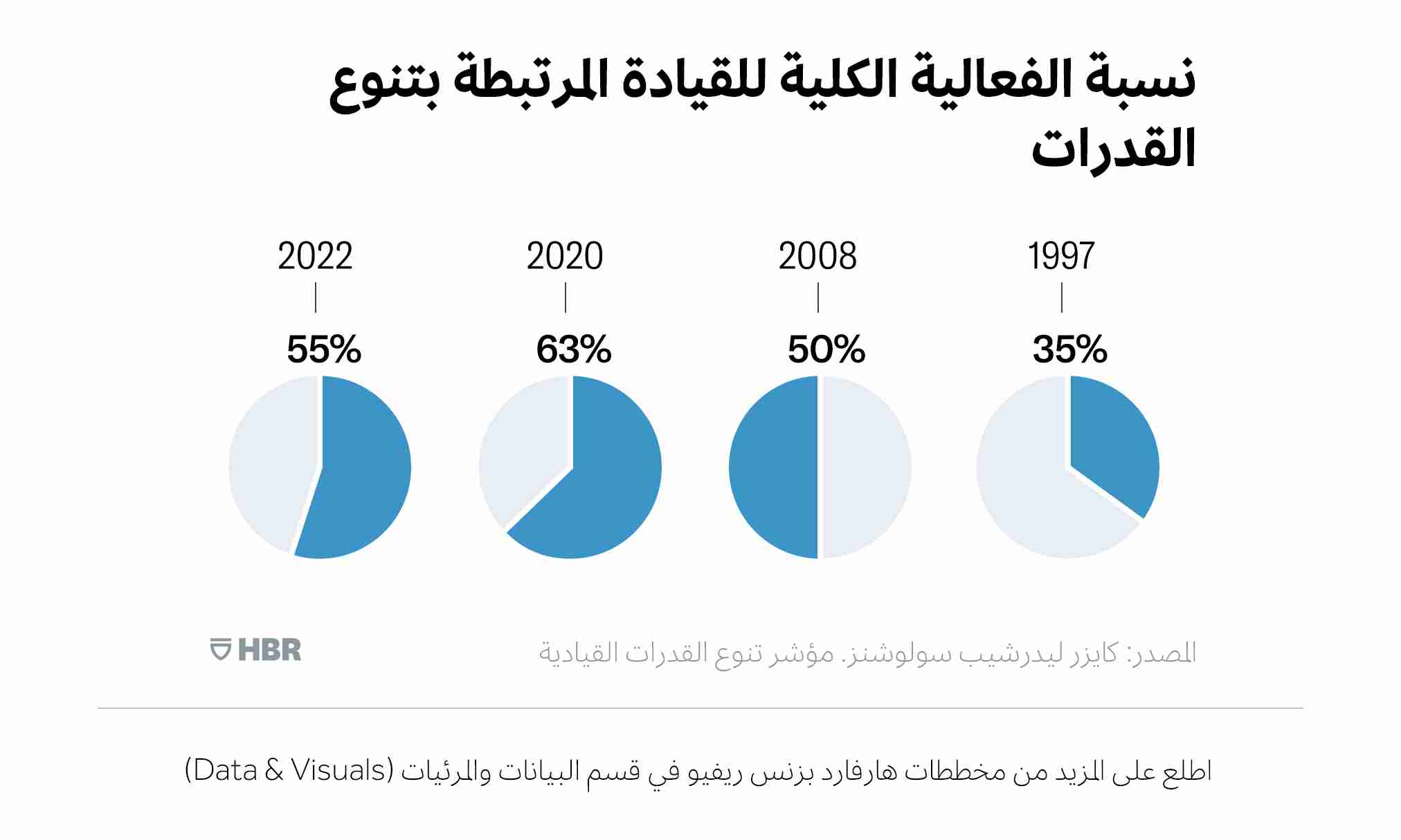 في الواقع، وخلال السنوات الـ 26 التي درسنا فيها القيادة المتنوعة القدرات اعتماداً على تقييمات زملاء العمل وعلى أداة تقييم متعددة المصادر تُدعى "مؤشر تنوع القدرات القيادية"، اتضح أن أهميتها زادت بمرور الوقت. مثّل تنوع القدرات ما يزيد قليلاً عن ثلث التباين في فعالية القيادة منذ أواخر التسعينيات وحتى منتصف العقد الأول من القرن الحادي والعشرين، بينما ارتفعت هذه النسبة إلى النصف في أواخر العقد الأول من القرن الحادي والعشرين. وفي السنة الأولى من الجائحة، زادت هذه النسبة إلى الثلثين تقريباً ثم انخفضت بشكل طفيف منذئذ ولكنها بقيت أعلى من مستويات ما قبل الجائحة.